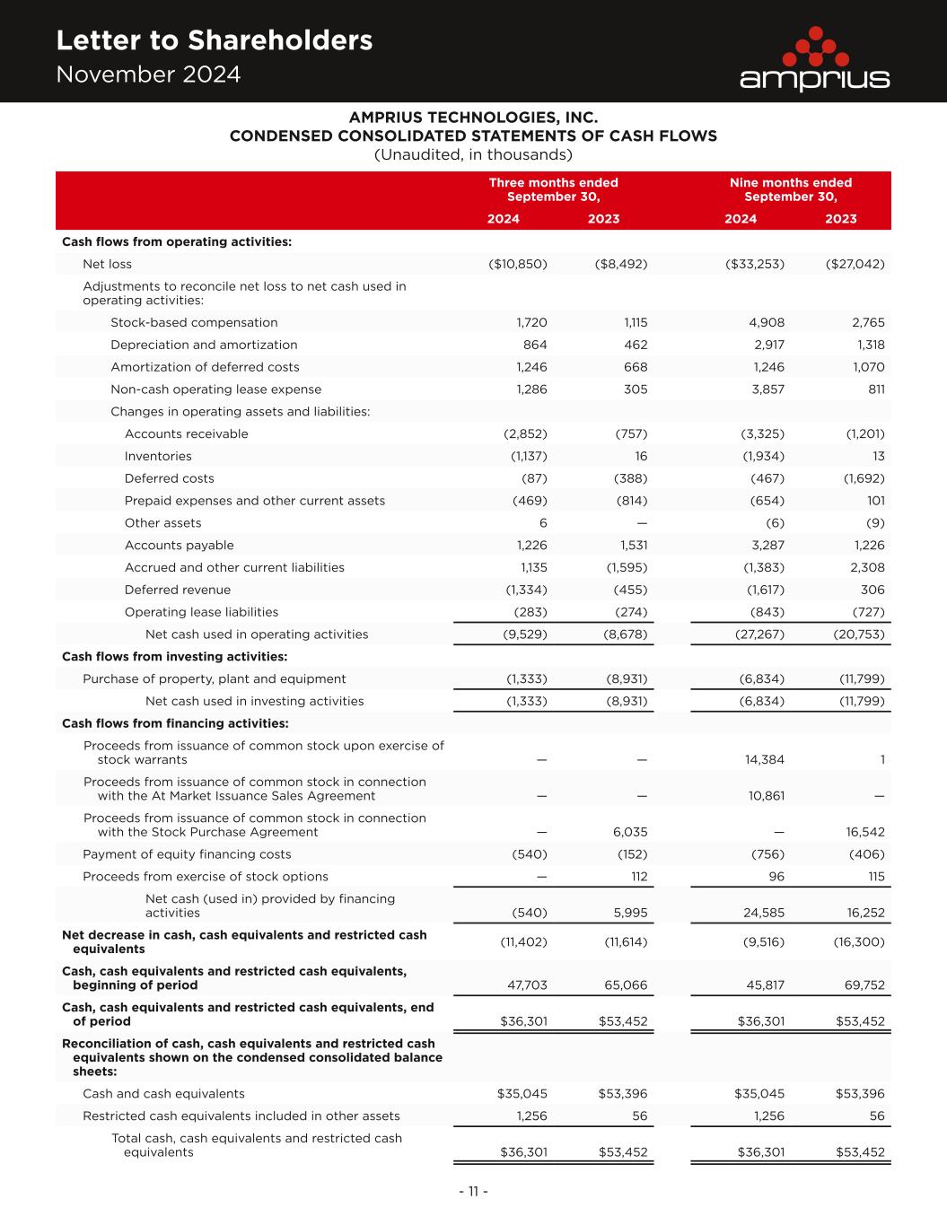 Letter to Shareholders November 2024 - 10 - AMPRIUS TECHNOLOGIES, INC. CONDENSED CONSOLIDATED STATEMENTS OF OPERATIONS (Unaudited, in thousands, except share and per share data) Three months ended September 30, Nine months ended September 30, 2024 2023 2024 2023 Revenue $7,855 $2,798 $13,536 $5,109 Cost of revenue 12,956 7,046 29,613 15,906 Gross loss (5,101) (4,248) (16,077) (10,797) Gross margin (65)% (152)% (119)% (211)% Operating expenses: Research and development 1,817 815 5,060 2,387 Selling, general and administrative 4,335 4,068 13,367 15,781 Total operating expenses 6,152 4,883 18,427 18,168 Loss from operations (11,253) (9,131) (34,504) (28,965) Other income, net 403 639 1,251 1,923 Net loss ($10,850) ($8,492) ($33,253) ($27,042) Weighted-average common shares outstanding: Basic and diluted 110,408,303 86,354,067 99,202,799 85,411,590 Net loss per share of common stock: Basic and diluted ($0.10) ($0.10) ($0.34) ($0.32)