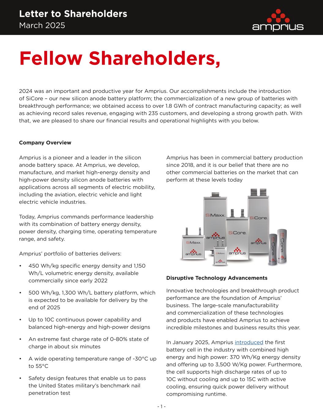 Letter to Shareholders March 2025 - 1 - Amprius has been in commercial battery production since 2018, and it is our belief that there are no other commercial batteries on the market that can perform at these levels today Disruptive Technology Advancements Innovative technologies and breakthrough product performance are the foundation of Amprius’ business. The large-scale manufacturability and commercialization of these technologies and products have enabled Amprius to achieve incredible milestones and business results this year. In January 2025, Amprius introduced the first battery cell in the industry with combined high energy and high power: 370 Wh/Kg energy density and offering up to 3,500 W/Kg power. Furthermore, the cell supports high discharge rates of up to 10C without cooling and up to 15C with active cooling, ensuring quick power delivery without compromising runtime. Company Overview Amprius is a pioneer and a leader in the silicon anode battery space. At Amprius, we develop, manufacture, and market high-energy density and high-power density silicon anode batteries with applications across all segments of electric mobility, including the aviation, electric vehicle and light electric vehicle industries. Today, Amprius commands performance leadership with its combination of battery energy density, power density, charging time, operating temperature range, and safety. Amprius’ portfolio of batteries delivers: • 450 Wh/kg specific energy density and 1,150 Wh/L volumetric energy density, available commercially since early 2022 • 500 Wh/kg, 1,300 Wh/L battery platform, which is expected to be available for delivery by the end of 2025 • Up to 10C continuous power capability and balanced high-energy and high-power designs • An extreme fast charge rate of 0-80% state of charge in about six minutes • A wide operating temperature range of -30°C up to 55°C • Safety design features that enable us to pass the United States military’s benchmark nail penetration test Fellow Shareholders, 2024 was an important and productive year for Amprius. Our accomplishments include the introduction of SiCore – our new silicon anode battery platform; the commercialization of a new group of batteries with breakthrough performance; we obtained access to over 1.8 GWh of contract manufacturing capacity; as well as achieving record sales revenue, engaging with 235 customers, and developing a strong growth path. With that, we are pleased to share our financial results and operational highlights with you below.