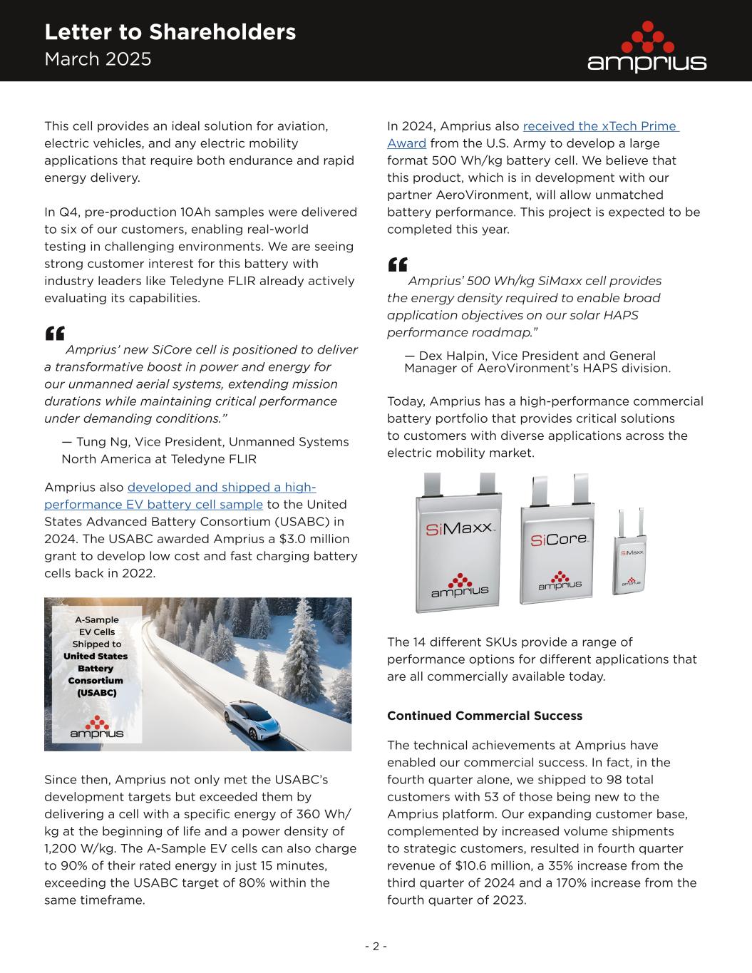 Letter to Shareholders March 2025 - 2 - This cell provides an ideal solution for aviation, electric vehicles, and any electric mobility applications that require both endurance and rapid energy delivery. In Q4, pre-production 10Ah samples were delivered to six of our customers, enabling real-world testing in challenging environments. We are seeing strong customer interest for this battery with industry leaders like Teledyne FLIR already actively evaluating its capabilities. “Amprius’ new SiCore cell is positioned to deliver a transformative boost in power and energy for our unmanned aerial systems, extending mission durations while maintaining critical performance under demanding conditions.” — Tung Ng, Vice President, Unmanned Systems North America at Teledyne FLIR Amprius also developed and shipped a high- performance EV battery cell sample to the United States Advanced Battery Consortium (USABC) in 2024. The USABC awarded Amprius a $3.0 million grant to develop low cost and fast charging battery cells back in 2022. Since then, Amprius not only met the USABC’s development targets but exceeded them by delivering a cell with a specific energy of 360 Wh/ kg at the beginning of life and a power density of 1,200 W/kg. The A-Sample EV cells can also charge to 90% of their rated energy in just 15 minutes, exceeding the USABC target of 80% within the same timeframe. In 2024, Amprius also received the xTech Prime Award from the U.S. Army to develop a large format 500 Wh/kg battery cell. We believe that this product, which is in development with our partner AeroVironment, will allow unmatched battery performance. This project is expected to be completed this year. “Amprius’ 500 Wh/kg SiMaxx cell provides the energy density required to enable broad application objectives on our solar HAPS performance roadmap.” — Dex Halpin, Vice President and General Manager of AeroVironment’s HAPS division. Today, Amprius has a high-performance commercial battery portfolio that provides critical solutions to customers with diverse applications across the electric mobility market. The 14 different SKUs provide a range of performance options for different applications that are all commercially available today. Continued Commercial Success The technical achievements at Amprius have enabled our commercial success. In fact, in the fourth quarter alone, we shipped to 98 total customers with 53 of those being new to the Amprius platform. Our expanding customer base, complemented by increased volume shipments to strategic customers, resulted in fourth quarter revenue of $10.6 million, a 35% increase from the third quarter of 2024 and a 170% increase from the fourth quarter of 2023.