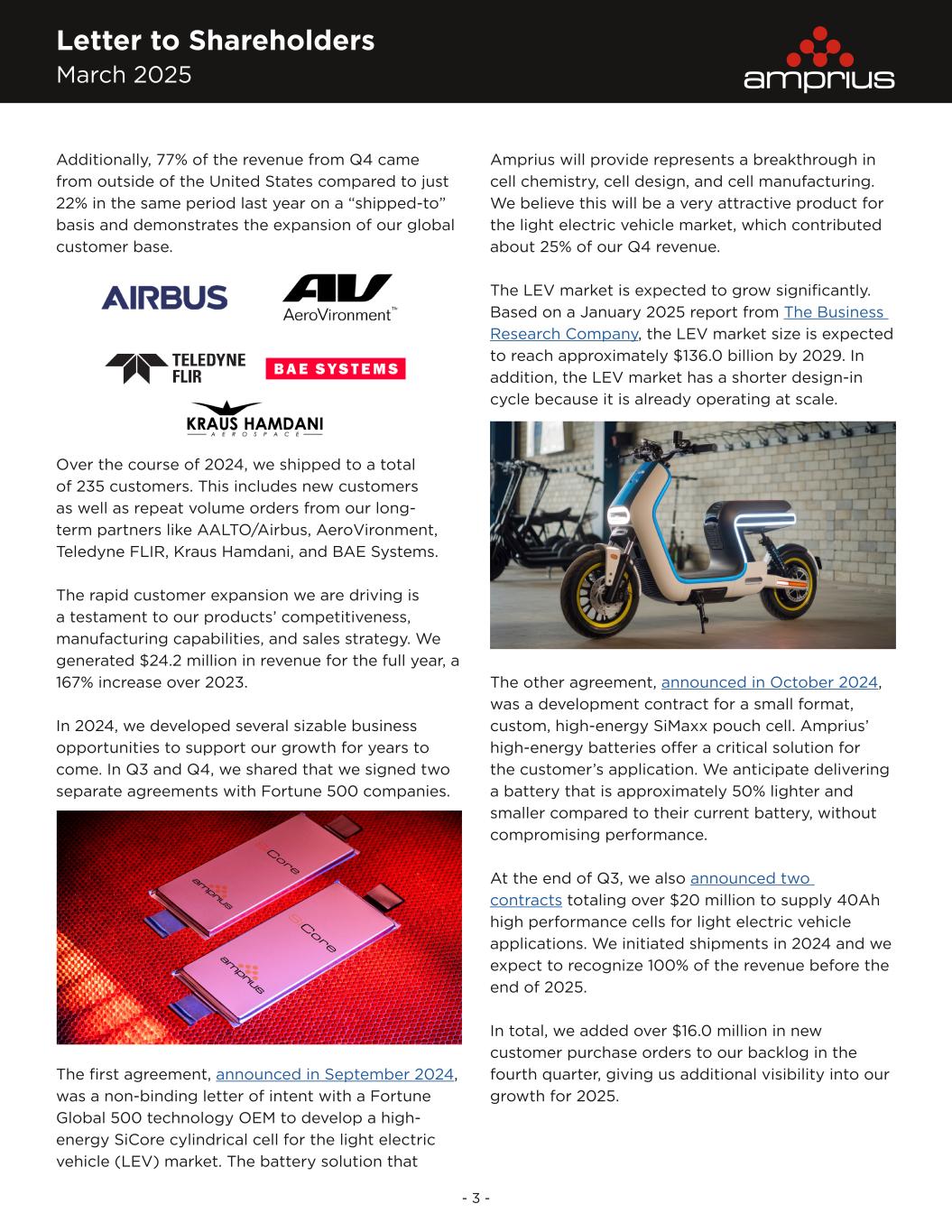 Letter to Shareholders March 2025 - 3 - Additionally, 77% of the revenue from Q4 came from outside of the United States compared to just 22% in the same period last year on a “shipped-to” basis and demonstrates the expansion of our global customer base. Over the course of 2024, we shipped to a total of 235 customers. This includes new customers as well as repeat volume orders from our long- term partners like AALTO/Airbus, AeroVironment, Teledyne FLIR, Kraus Hamdani, and BAE Systems. The rapid customer expansion we are driving is a testament to our products’ competitiveness, manufacturing capabilities, and sales strategy. We generated $24.2 million in revenue for the full year, a 167% increase over 2023. In 2024, we developed several sizable business opportunities to support our growth for years to come. In Q3 and Q4, we shared that we signed two separate agreements with Fortune 500 companies. The first agreement, announced in September 2024, was a non-binding letter of intent with a Fortune Global 500 technology OEM to develop a high- energy SiCore cylindrical cell for the light electric vehicle (LEV) market. The battery solution that Amprius will provide represents a breakthrough in cell chemistry, cell design, and cell manufacturing. We believe this will be a very attractive product for the light electric vehicle market, which contributed about 25% of our Q4 revenue. The LEV market is expected to grow significantly. Based on a January 2025 report from The Business Research Company, the LEV market size is expected to reach approximately $136.0 billion by 2029. In addition, the LEV market has a shorter design-in cycle because it is already operating at scale. The other agreement, announced in October 2024, was a development contract for a small format, custom, high-energy SiMaxx pouch cell. Amprius’ high-energy batteries offer a critical solution for the customer’s application. We anticipate delivering a battery that is approximately 50% lighter and smaller compared to their current battery, without compromising performance. At the end of Q3, we also announced two contracts totaling over $20 million to supply 40Ah high performance cells for light electric vehicle applications. We initiated shipments in 2024 and we expect to recognize 100% of the revenue before the end of 2025. In total, we added over $16.0 million in new customer purchase orders to our backlog in the fourth quarter, giving us additional visibility into our growth for 2025.