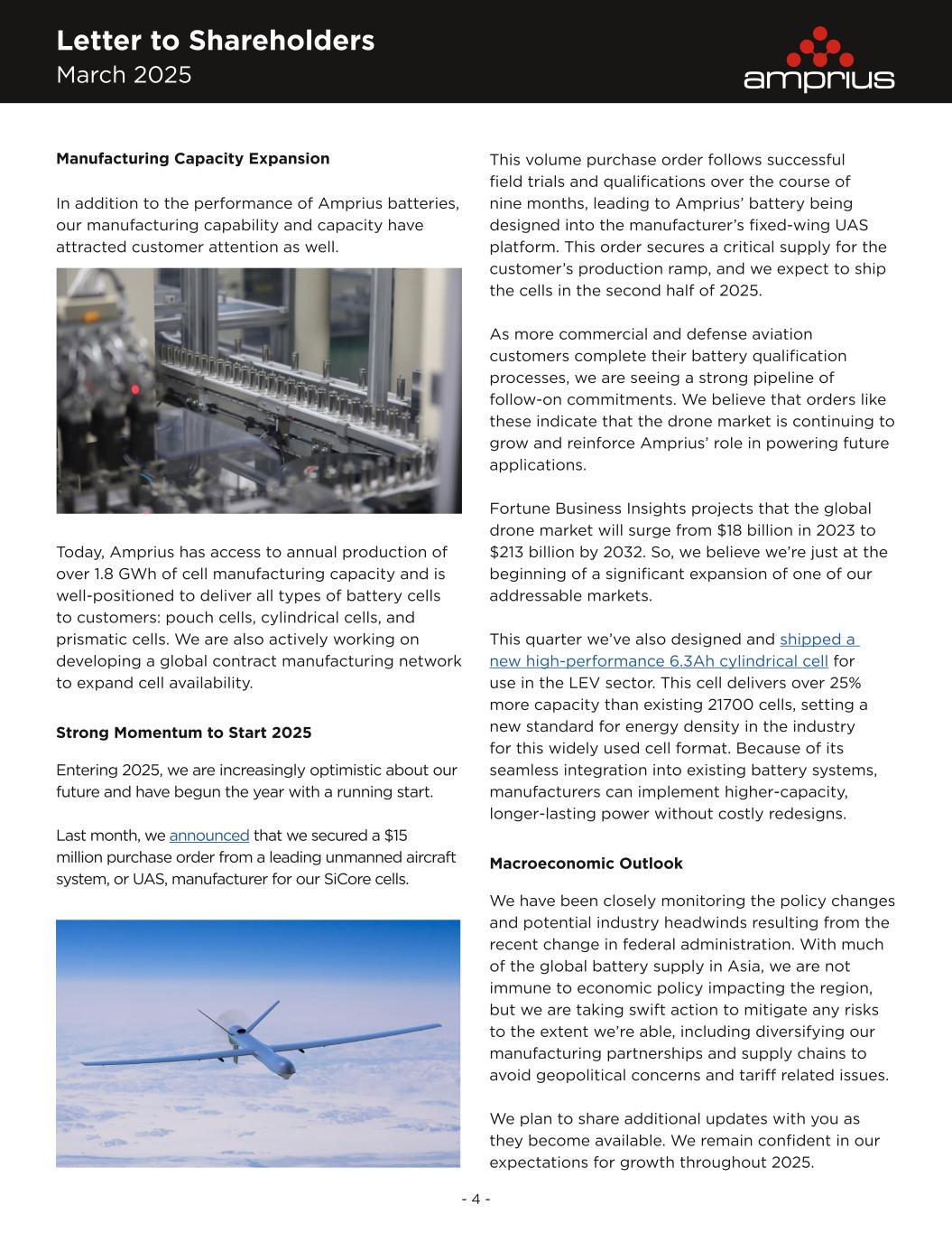 Letter to Shareholders March 2025 - 4 - Manufacturing Capacity Expansion In addition to the performance of Amprius batteries, our manufacturing capability and capacity have attracted customer attention as well. Today, Amprius has access to annual production of over 1.8 GWh of cell manufacturing capacity and is well-positioned to deliver all types of battery cells to customers: pouch cells, cylindrical cells, and prismatic cells. We are also actively working on developing a global contract manufacturing network to expand cell availability. Strong Momentum to Start 2025 Entering 2025, we are increasingly optimistic about our future and have begun the year with a running start. Last month, we announced that we secured a $15 million purchase order from a leading unmanned aircraft system, or UAS, manufacturer for our SiCore cells. This volume purchase order follows successful field trials and qualifications over the course of nine months, leading to Amprius’ battery being designed into the manufacturer’s fixed-wing UAS platform. This order secures a critical supply for the customer’s production ramp, and we expect to ship the cells in the second half of 2025. As more commercial and defense aviation customers complete their battery qualification processes, we are seeing a strong pipeline of follow-on commitments. We believe that orders like these indicate that the drone market is continuing to grow and reinforce Amprius’ role in powering future applications. Fortune Business Insights projects that the global drone market will surge from $18 billion in 2023 to $213 billion by 2032. So, we believe we’re just at the beginning of a significant expansion of one of our addressable markets. This quarter we’ve also designed and shipped a new high-performance 6.3Ah cylindrical cell for use in the LEV sector. This cell delivers over 25% more capacity than existing 21700 cells, setting a new standard for energy density in the industry for this widely used cell format. Because of its seamless integration into existing battery systems, manufacturers can implement higher-capacity, longer-lasting power without costly redesigns. Macroeconomic Outlook We have been closely monitoring the policy changes and potential industry headwinds resulting from the recent change in federal administration. With much of the global battery supply in Asia, we are not immune to economic policy impacting the region, but we are taking swift action to mitigate any risks to the extent we’re able, including diversifying our manufacturing partnerships and supply chains to avoid geopolitical concerns and tariff related issues. We plan to share additional updates with you as they become available. We remain confident in our expectations for growth throughout 2025.
