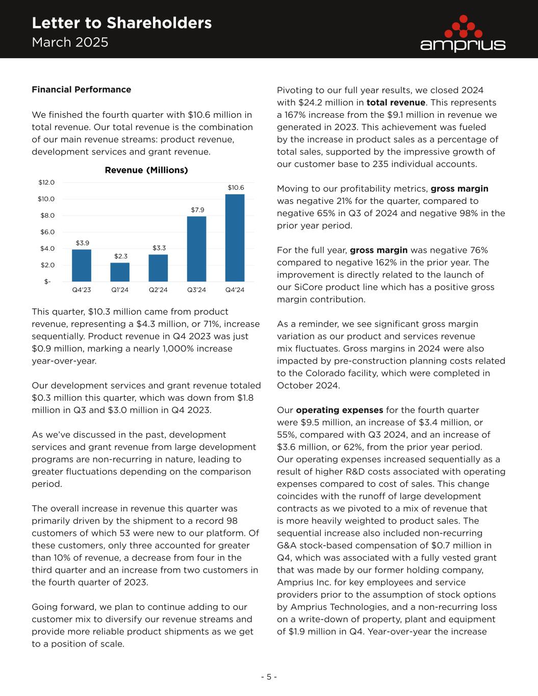 Letter to Shareholders March 2025 - 5 - Financial Performance We finished the fourth quarter with $10.6 million in total revenue. Our total revenue is the combination of our main revenue streams: product revenue, development services and grant revenue. This quarter, $10.3 million came from product revenue, representing a $4.3 million, or 71%, increase sequentially. Product revenue in Q4 2023 was just $0.9 million, marking a nearly 1,000% increase year-over-year. Our development services and grant revenue totaled $0.3 million this quarter, which was down from $1.8 million in Q3 and $3.0 million in Q4 2023. As we’ve discussed in the past, development services and grant revenue from large development programs are non-recurring in nature, leading to greater fluctuations depending on the comparison period. The overall increase in revenue this quarter was primarily driven by the shipment to a record 98 customers of which 53 were new to our platform. Of these customers, only three accounted for greater than 10% of revenue, a decrease from four in the third quarter and an increase from two customers in the fourth quarter of 2023. Going forward, we plan to continue adding to our customer mix to diversify our revenue streams and provide more reliable product shipments as we get to a position of scale. Pivoting to our full year results, we closed 2024 with $24.2 million in total revenue. This represents a 167% increase from the $9.1 million in revenue we generated in 2023. This achievement was fueled by the increase in product sales as a percentage of total sales, supported by the impressive growth of our customer base to 235 individual accounts. Moving to our profitability metrics, gross margin was negative 21% for the quarter, compared to negative 65% in Q3 of 2024 and negative 98% in the prior year period. For the full year, gross margin was negative 76% compared to negative 162% in the prior year. The improvement is directly related to the launch of our SiCore product line which has a positive gross margin contribution. As a reminder, we see significant gross margin variation as our product and services revenue mix fluctuates. Gross margins in 2024 were also impacted by pre-construction planning costs related to the Colorado facility, which were completed in October 2024. Our operating expenses for the fourth quarter were $9.5 million, an increase of $3.4 million, or 55%, compared with Q3 2024, and an increase of $3.6 million, or 62%, from the prior year period. Our operating expenses increased sequentially as a result of higher R&D costs associated with operating expenses compared to cost of sales. This change coincides with the runoff of large development contracts as we pivoted to a mix of revenue that is more heavily weighted to product sales. The sequential increase also included non-recurring G&A stock-based compensation of $0.7 million in Q4, which was associated with a fully vested grant that was made by our former holding company, Amprius Inc. for key employees and service providers prior to the assumption of stock options by Amprius Technologies, and a non-recurring loss on a write-down of property, plant and equipment of $1.9 million in Q4. Year-over-year the increase