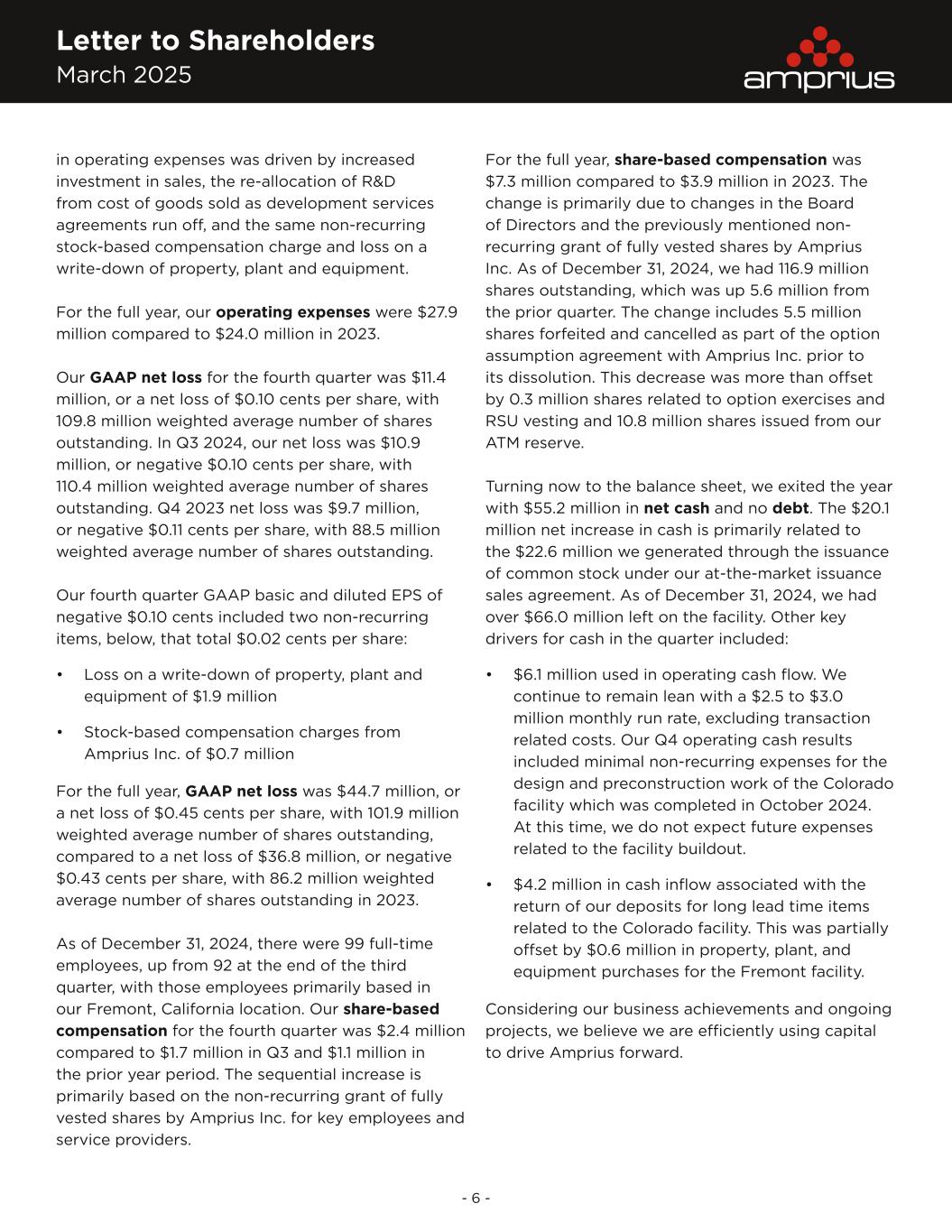 Letter to Shareholders March 2025 - 6 - in operating expenses was driven by increased investment in sales, the re-allocation of R&D from cost of goods sold as development services agreements run off, and the same non-recurring stock-based compensation charge and loss on a write-down of property, plant and equipment. For the full year, our operating expenses were $27.9 million compared to $24.0 million in 2023. Our GAAP net loss for the fourth quarter was $11.4 million, or a net loss of $0.10 cents per share, with 109.8 million weighted average number of shares outstanding. In Q3 2024, our net loss was $10.9 million, or negative $0.10 cents per share, with 110.4 million weighted average number of shares outstanding. Q4 2023 net loss was $9.7 million, or negative $0.11 cents per share, with 88.5 million weighted average number of shares outstanding. Our fourth quarter GAAP basic and diluted EPS of negative $0.10 cents included two non-recurring items, below, that total $0.02 cents per share: • Loss on a write-down of property, plant and equipment of $1.9 million • Stock-based compensation charges from Amprius Inc. of $0.7 million For the full year, GAAP net loss was $44.7 million, or a net loss of $0.45 cents per share, with 101.9 million weighted average number of shares outstanding, compared to a net loss of $36.8 million, or negative $0.43 cents per share, with 86.2 million weighted average number of shares outstanding in 2023. As of December 31, 2024, there were 99 full-time employees, up from 92 at the end of the third quarter, with those employees primarily based in our Fremont, California location. Our share-based compensation for the fourth quarter was $2.4 million compared to $1.7 million in Q3 and $1.1 million in the prior year period. The sequential increase is primarily based on the non-recurring grant of fully vested shares by Amprius Inc. for key employees and service providers. For the full year, share-based compensation was $7.3 million compared to $3.9 million in 2023. The change is primarily due to changes in the Board of Directors and the previously mentioned non- recurring grant of fully vested shares by Amprius Inc. As of December 31, 2024, we had 116.9 million shares outstanding, which was up 5.6 million from the prior quarter. The change includes 5.5 million shares forfeited and cancelled as part of the option assumption agreement with Amprius Inc. prior to its dissolution. This decrease was more than offset by 0.3 million shares related to option exercises and RSU vesting and 10.8 million shares issued from our ATM reserve. Turning now to the balance sheet, we exited the year with $55.2 million in net cash and no debt. The $20.1 million net increase in cash is primarily related to the $22.6 million we generated through the issuance of common stock under our at-the-market issuance sales agreement. As of December 31, 2024, we had over $66.0 million left on the facility. Other key drivers for cash in the quarter included: • $6.1 million used in operating cash flow. We continue to remain lean with a $2.5 to $3.0 million monthly run rate, excluding transaction related costs. Our Q4 operating cash results included minimal non-recurring expenses for the design and preconstruction work of the Colorado facility which was completed in October 2024. At this time, we do not expect future expenses related to the facility buildout. • $4.2 million in cash inflow associated with the return of our deposits for long lead time items related to the Colorado facility. This was partially offset by $0.6 million in property, plant, and equipment purchases for the Fremont facility. Considering our business achievements and ongoing projects, we believe we are efficiently using capital to drive Amprius forward.