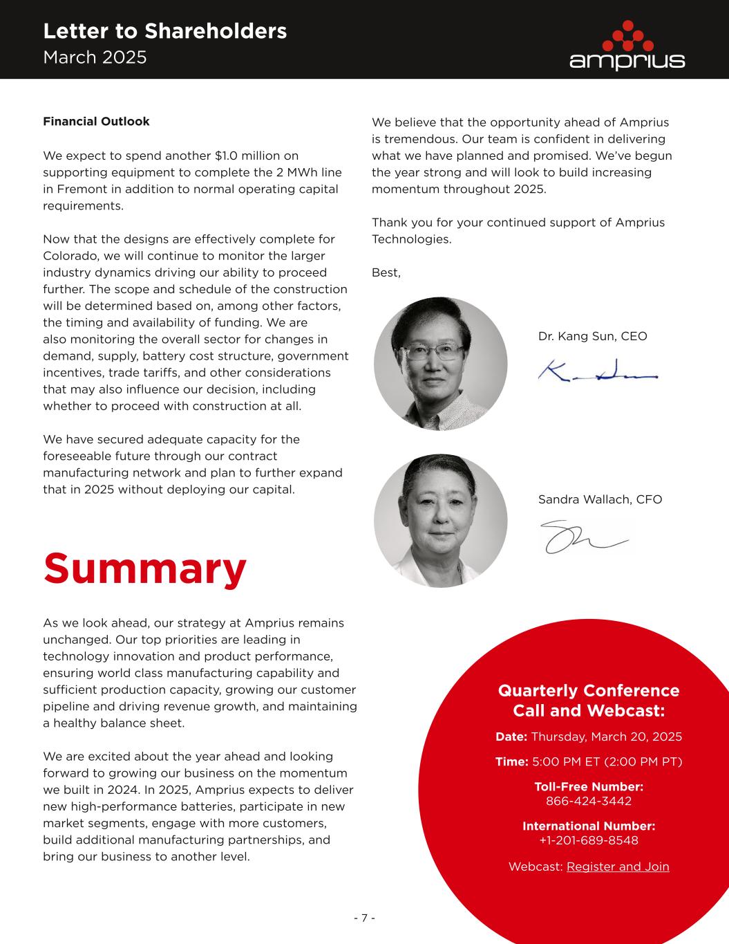 Letter to Shareholders March 2025 - 7 - Financial Outlook We expect to spend another $1.0 million on supporting equipment to complete the 2 MWh line in Fremont in addition to normal operating capital requirements. Now that the designs are effectively complete for Colorado, we will continue to monitor the larger industry dynamics driving our ability to proceed further. The scope and schedule of the construction will be determined based on, among other factors, the timing and availability of funding. We are also monitoring the overall sector for changes in demand, supply, battery cost structure, government incentives, trade tariffs, and other considerations that may also influence our decision, including whether to proceed with construction at all. We have secured adequate capacity for the foreseeable future through our contract manufacturing network and plan to further expand that in 2025 without deploying our capital. As we look ahead, our strategy at Amprius remains unchanged. Our top priorities are leading in technology innovation and product performance, ensuring world class manufacturing capability and sufficient production capacity, growing our customer pipeline and driving revenue growth, and maintaining a healthy balance sheet. We are excited about the year ahead and looking forward to growing our business on the momentum we built in 2024. In 2025, Amprius expects to deliver new high-performance batteries, participate in new market segments, engage with more customers, build additional manufacturing partnerships, and bring our business to another level. We believe that the opportunity ahead of Amprius is tremendous. Our team is confident in delivering what we have planned and promised. We’ve begun the year strong and will look to build increasing momentum throughout 2025. Thank you for your continued support of Amprius Technologies. Best, Summary Dr. Kang Sun, CEO Sandra Wallach, CFO Quarterly Conference Call and Webcast: Date: Thursday, March 20, 2025 Time: 5:00 PM ET (2:00 PM PT) Toll-Free Number: 866-424-3442 International Number: +1-201-689-8548 Webcast: Register and Join
