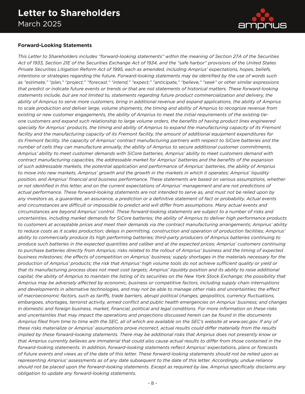 Letter to Shareholders March 2025 - 8 - Forward-Looking Statements This Letter to Shareholders includes “forward-looking statements” within the meaning of Section 27A of the Securities Act of 1933, Section 21E of the Securities Exchange Act of 1934, and the “safe harbor” provisions of the United States Private Securities Litigation Reform Act of 1995, each as amended, including Amprius’ expectations, hopes, beliefs, intentions or strategies regarding the future. Forward-looking statements may be identified by the use of words such as “estimate,” “plan,” “project,” “forecast,” “intend,” “expect,” “anticipate,” “believe,” “seek” or other similar expressions that predict or indicate future events or trends or that are not statements of historical matters. These forward-looking statements include, but are not limited to, statements regarding future product commercialization and delivery, the ability of Amprius to serve more customers, bring in additional revenue and expand applications, the ability of Amprius to scale production and deliver large, volume shipments, the timing and ability of Amprius to recognize revenue from existing or new customer engagements, the ability of Amprius to meet the initial requirements of the existing tie- one customers and expand such relationship to large volume orders, the benefits of having product lines engineered specially for Amprius’ products, the timing and ability of Amprius to expand the manufacturing capacity of its Fremont facility and the manufacturing capacity of its Fremont facility, the amount of additional equipment expenditures for its Fremont facility, the capacity of Amprius’ contract manufacturing partners with respect to SiCore batteries and the number of cells they can manufacture annually, the ability of Amprius to secure additional customer commitments, Amprius’ ability to meet customer demands with SiCore batteries, Amprius’ ability to meet customers demand with contract manufacturing capacities, the addressable market for Amprius’ batteries and the benefits of the expansion of such addressable markets, the potential application and performance of Amprius’ batteries, the ability of Amprius to move into new markets, Amprius’ growth and the growth in the markets in which it operates; Amprius’ liquidity position, and Amprius’ financial and business performance. These statements are based on various assumptions, whether or not identified in this letter, and on the current expectations of Amprius’ management and are not predictions of actual performance. These forward-looking statements are not intended to serve as, and must not be relied upon by any investors as, a guarantee, an assurance, a prediction or a definitive statement of fact or probability. Actual events and circumstances are difficult or impossible to predict and will differ from assumptions. Many actual events and circumstances are beyond Amprius’ control. These forward-looking statements are subject to a number of risks and uncertainties, including market demands for SiCore batteries; the ability of Amprius to deliver high performance products to customers at acceptable prices and meet their demands via the contract manufacturing arrangements; Amprius’ ability to reduce costs as it scales production; delays in permitting, construction and operation of production facilities; Amprius’ ability to commercially produce its high performing batteries; third-party producers of Amprius batteries continuing to produce such batteries in the expected quantities and caliber and at the expected prices; Amprius’ customers continuing to purchase batteries directly from Amprius; risks related to the rollout of Amprius’ business and the timing of expected business milestones; the effects of competition on Amprius’ business; supply shortages in the materials necessary for the production of Amprius’ products; the risk that Amprius’ high volume tools do not achieve sufficient quality or yield or that its manufacturing process does not meet cost targets; Amprius’ liquidity position and its ability to raise additional capital; the ability of Amprius to maintain the listing of its securities on the New York Stock Exchange; the possibility that Amprius may be adversely affected by economic, business or competitive factors, including supply chain interruptions and developments in alternative technologies, and may not be able to manage other risks and uncertainties; the effect of macroeconomic factors, such as tariffs, trade barriers, abrupt political changes, geopolitics, currency fluctuations, embargoes, shortages, terrorist activity, armed conflict and public health emergencies on Amprius’ business; and changes in domestic and foreign business, market, financial, political and legal conditions. For more information on these risks and uncertainties that may impact the operations and projections discussed herein can be found in the documents Amprius filed from time to time with the SEC, all of which are available on the SEC’s website at www.sec.gov. If any of these risks materialize or Amprius’ assumptions prove incorrect, actual results could differ materially from the results implied by these forward-looking statements. There may be additional risks that Amprius does not presently know or that Amprius currently believes are immaterial that could also cause actual results to differ from those contained in the forward-looking statements. In addition, forward-looking statements reflect Amprius’ expectations, plans or forecasts of future events and views as of the date of this letter. These forward-looking statements should not be relied upon as representing Amprius’ assessments as of any date subsequent to the date of this letter. Accordingly, undue reliance should not be placed upon the forward-looking statements. Except as required by law, Amprius specifically disclaims any obligation to update any forward-