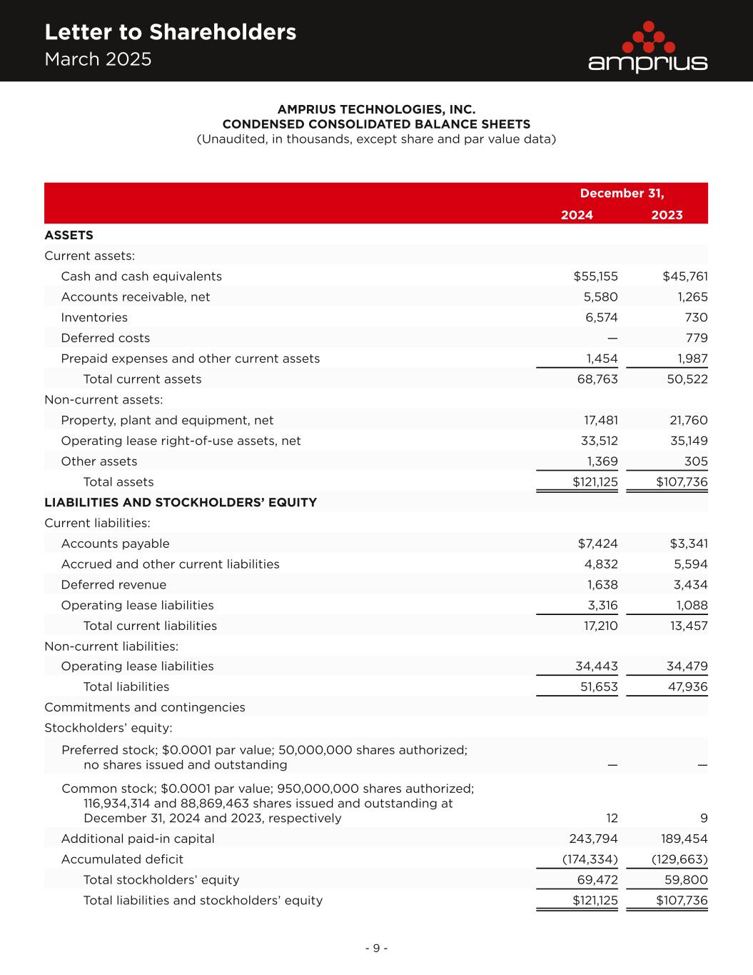 Letter to Shareholders March 2025 - 9 - AMPRIUS TECHNOLOGIES, INC. CONDENSED CONSOLIDATED BALANCE SHEETS (Unaudited, in thousands, except share and par value data) December 31, 2024 2023 ASSETS Current assets: Cash and cash equivalents $55,155 $45,761 Accounts receivable, net 5,580 1,265 Inventories 6,574 730 Deferred costs — 779 Prepaid expenses and other current assets 1,454 1,987 Total current assets 68,763 50,522 Non-current assets: Property, plant and equipment, net 17,481 21,760 Operating lease right-of-use assets, net 33,512 35,149 Other assets 1,369 305 Total assets $121,125 $107,736 LIABILITIES AND STOCKHOLDERS’ EQUITY Current liabilities: Accounts payable $7,424 $3,341 Accrued and other current liabilities 4,832 5,594 Deferred revenue 1,638 3,434 Operating lease liabilities 3,316 1,088 Total current liabilities 17,210 13,457 Non-current liabilities: Operating lease liabilities 34,443 34,479 Total liabilities 51,653 47,936 Commitments and contingencies Stockholders’ equity: Preferred stock; $0.0001 par value; 50,000,000 shares authorized; no shares issued and outstanding — — Common stock; $0.0001 par value; 950,000,000 shares authorized; 116,934,314 and 88,869,463 shares issued and outstanding at December 31, 2024 and 2023, respectively 12 9 Additional paid-in capital 243,794 189,454 Accumulated deficit (174,334) (129,663) Total stockholders’ equity 69,472 59,800 Total liabilities and stockholders’ equity $121,125 $107,736