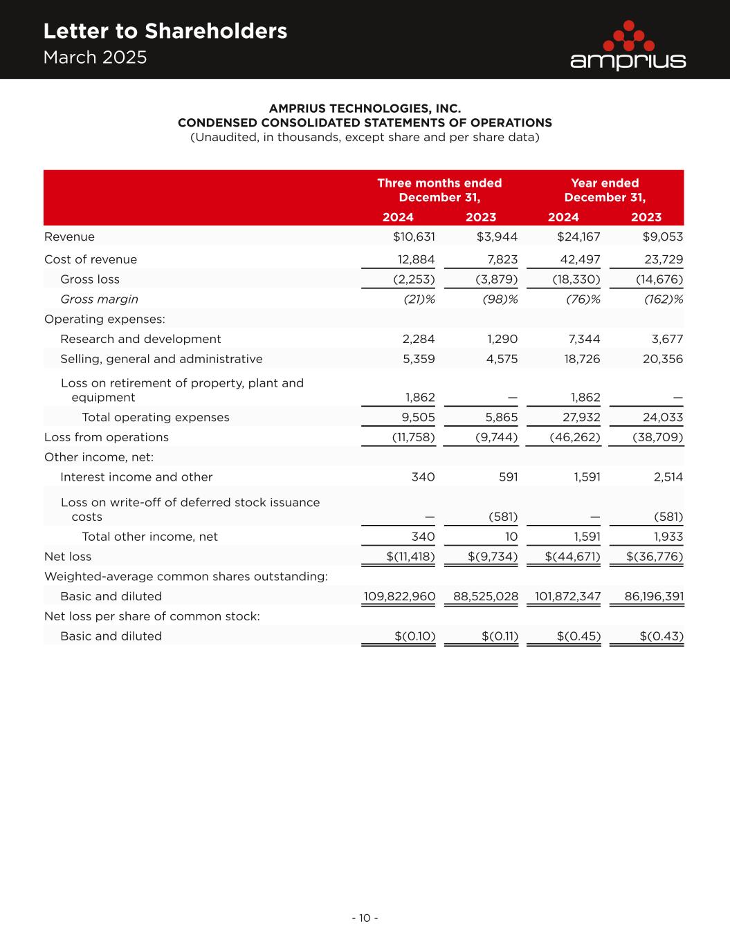 Letter to Shareholders March 2025 - 10 - AMPRIUS TECHNOLOGIES, INC. CONDENSED CONSOLIDATED STATEMENTS OF OPERATIONS (Unaudited, in thousands, except share and per share data) Three months ended December 31, Year ended December 31, 2024 2023 2024 2023 Revenue $10,631 $3,944 $24,167 $9,053 Cost of revenue 12,884 7,823 42,497 23,729 Gross loss (2,253) (3,879) (18,330) (14,676) Gross margin (21)% (98)% (76)% (162)% Operating expenses: Research and development 2,284 1,290 7,344 3,677 Selling, general and administrative 5,359 4,575 18,726 20,356 Loss on retirement of property, plant and equipment 1,862 — 1,862 — Total operating expenses 9,505 5,865 27,932 24,033 Loss from operations (11,758) (9,744) (46,262) (38,709) Other income, net: Interest income and other 340 591 1,591 2,514 Loss on write-off of deferred stock issuance costs — (581) — (581) Total other income, net 340 10 1,591 1,933 Net loss $(11,418) $(9,734) $(44,671) $(36,776) Weighted-average common shares outstanding: Basic and diluted 109,822,960 88,525,028 101,872,347 86,196,391 Net loss per share of common stock: Basic and diluted $(0.10) $(0.11) $(0.45) $(0.43)