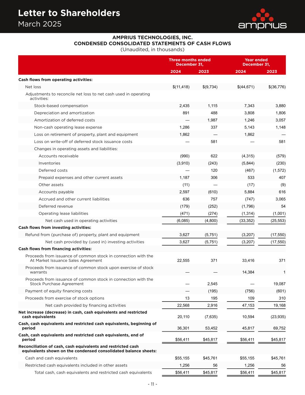 Letter to Shareholders March 2025 - 11 - AMPRIUS TECHNOLOGIES, INC. CONDENSED CONSOLIDATED STATEMENTS OF CASH FLOWS (Unaudited, in thousands) Three months ended December 31, Year ended December 31, 2024 2023 2024 2023 Cash flows from operating activities: Net loss $(11,418) $(9,734) $(44,671) $(36,776) Adjustments to reconcile net loss to net cash used in operating activities: Stock-based compensation 2,435 1,115 7,343 3,880 Depreciation and amortization 891 488 3,808 1,806 Amortization of deferred costs — 1,987 1,246 3,057 Non-cash operating lease expense 1,286 337 5,143 1,148 Loss on retirement of property, plant and equipment 1,862 — 1,862 — Loss on write-off of deferred stock issuance costs — 581 — 581 Changes in operating assets and liabilities: Accounts receivable (990) 622 (4,315) (579) Inventories (3,910) (243) (5,844) (230) Deferred costs — 120 (467) (1,572) Prepaid expenses and other current assets 1,187 306 533 407 Other assets (11) — (17) (9) Accounts payable 2,597 (610) 5,884 616 Accrued and other current liabilities 636 757 (747) 3,065 Deferred revenue (179) (252) (1,796) 54 Operating lease liabilities (471) (274) (1,314) (1,001) Net cash used in operating activities (6,085) (4,800) (33,352) (25,553) Cash flows from investing activities: Refund from (purchase of) property, plant and equipment 3,627 (5,751) (3,207) (17,550) Net cash provided by (used in) investing activities 3,627 (5,751) (3,207) (17,550) Cash flows from financing activities: Proceeds from issuance of common stock in connection with the At Market Issuance Sales Agreement 22,555 371 33,416 371 Proceeds from issuance of common stock upon exercise of stock warrants — — 14,384 1 Proceeds from issuance of common stock in connection with the Stock Purchase Agreement — 2,545 — 19,087 Payment of equity financing costs — (195) (756) (601) Proceeds from exercise of stock options 13 195 109 310 Net cash provided by financing activities 22,568 2,916 47,153 19,168 Net increase (decrease) in cash, cash equivalents and restricted cash equivalents 20,110 (7,635) 10,594 (23,935) Cash, cash equivalents and restricted cash equivalents, beginning of period 36,301 53,452 45,817 69,752 Cash, cash equivalents and restricted cash equivalents, end of period $56,411 $45,817 $56,411 $45,817 Reconciliation of cash, cash equivalents and restricted cash equivalents shown on the condensed consolidated balance sheets: Cash and cash equivalents $55,155 $45,761 $55,155 $45,761 Restricted cash equivalents included in other assets 1,256 56 1,256 56 Total cash, cash equivalents and restricted cash equivalents $56,411 $45,817 $56,411 $45,817