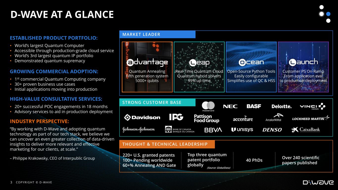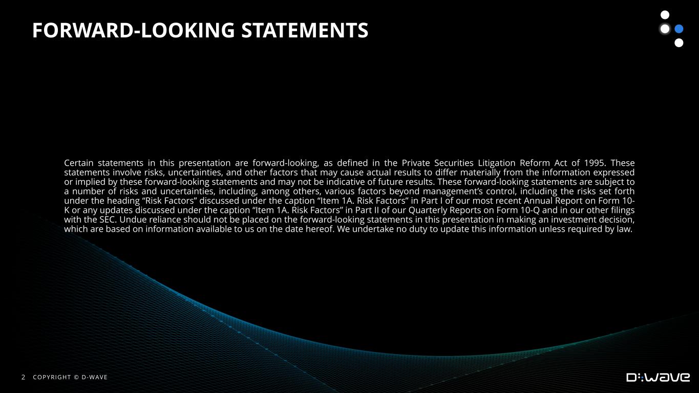 FORWARD-LOOKING STATEMENTS Certain statements in this presentation are forward-looking, as defined in the Private Securities Litigation Reform Act of 1995. These statements involve risks, uncertainties, and other factors that may cause actual results to differ materially from the information expressed or implied by these forward-looking statements and may not be indicative of future results. These forward-looking statements are subject to a number of risks and uncertainties, including, among others, various factors beyond management’s control, including the risks set forth under the heading “Risk Factors” discussed under the caption “Item 1A. Risk Factors” in Part I of our most recent Annual Report on Form 10- K or any updates discussed under the caption “Item 1A. Risk Factors” in Part II of our Quarterly Reports on Form 10-Q and in our other filings with the SEC. Undue reliance should not be placed on the forward-looking statements in this presentation in making an investment decision, which are based on information available to us on the date hereof. We undertake no duty to update this information unless required by law. 2 COPYRIGHT © D-WAVE