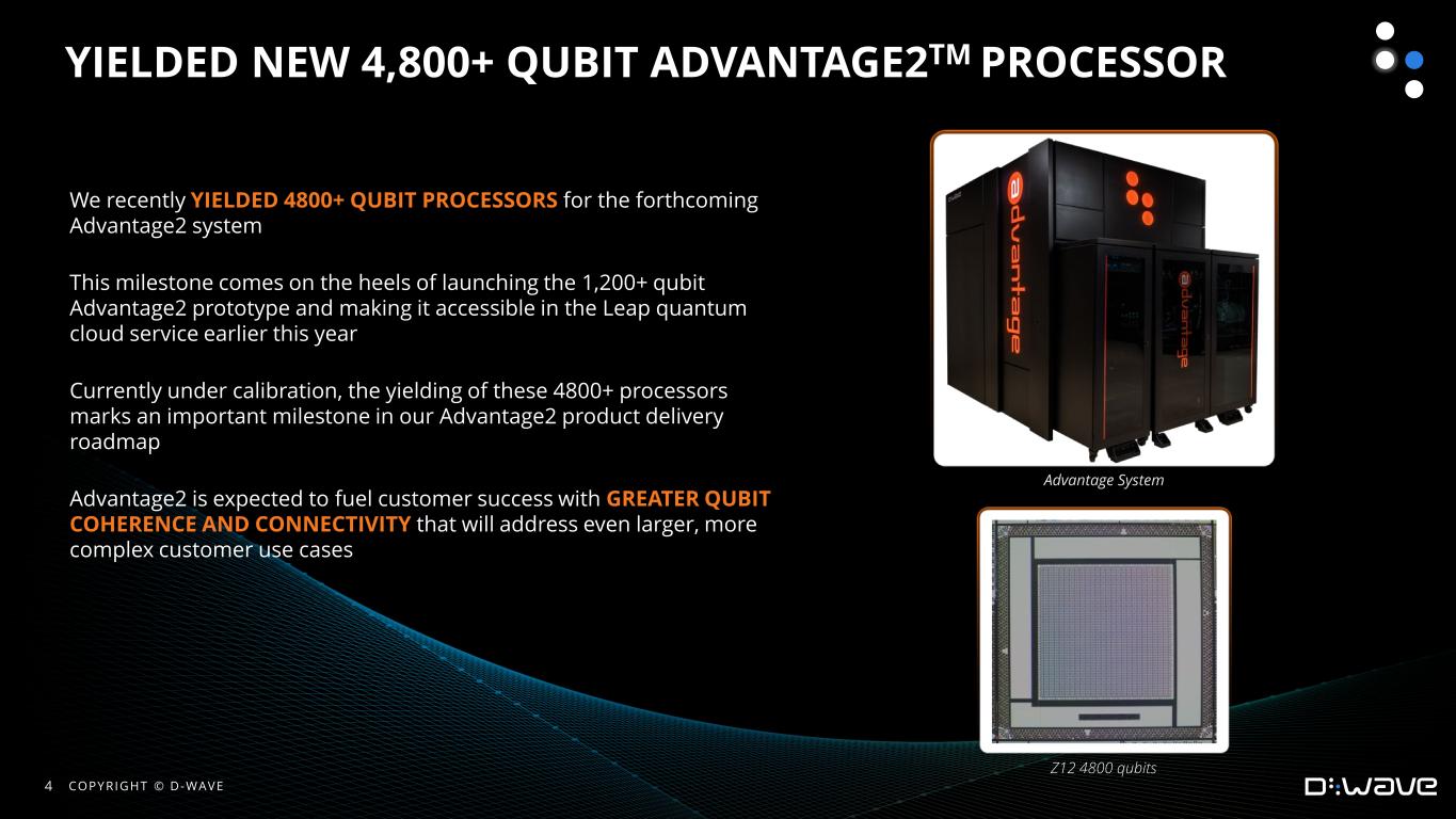 YIELDED NEW 4,800+ QUBIT ADVANTAGE2TM PROCESSOR We recently YIELDED 4800+ QUBIT PROCESSORS for the forthcoming Advantage2 system This milestone comes on the heels of launching the 1,200+ qubit Advantage2 prototype and making it accessible in the Leap quantum cloud service earlier this year Currently under calibration, the yielding of these 4800+ processors marks an important milestone in our Advantage2 product delivery roadmap Advantage2 is expected to fuel customer success with GREATER QUBIT COHERENCE AND CONNECTIVITY that will address even larger, more complex customer use cases Advantage System 4 COPYRIGHT © D-WAVE Z12 4800 qubits