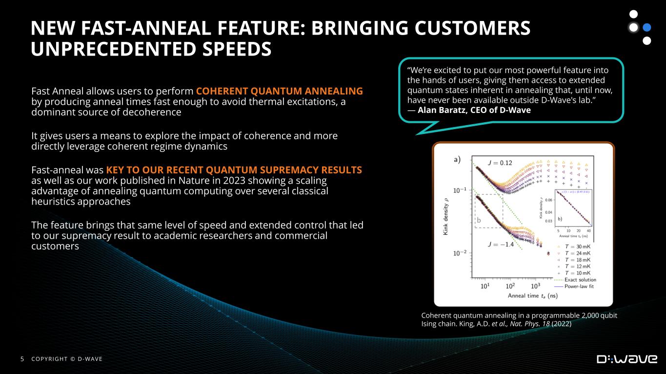 5 COPYRIGHT © D-WAVE Fast Anneal allows users to perform COHERENT QUANTUM ANNEALING by producing anneal times fast enough to avoid thermal excitations, a dominant source of decoherence It gives users a means to explore the impact of coherence and more directly leverage coherent regime dynamics Fast-anneal was KEY TO OUR RECENT QUANTUM SUPREMACY RESULTS as well as our work published in Nature in 2023 showing a scaling advantage of annealing quantum computing over several classical heuristics approaches The feature brings that same level of speed and extended control that led to our supremacy result to academic researchers and commercial customers NEW FAST-ANNEAL FEATURE: BRINGING CUSTOMERS UNPRECEDENTED SPEEDS Coherent quantum annealing in a programmable 2,000 qubit Ising chain. King, A.D. et al., Nat. Phys. 18 (2022) “We’re excited to put our most powerful feature into the hands of users, giving them access to extended quantum states inherent in annealing that, until now, have never been available outside D-Wave's lab.” — Alan Baratz, CEO of D-Wave