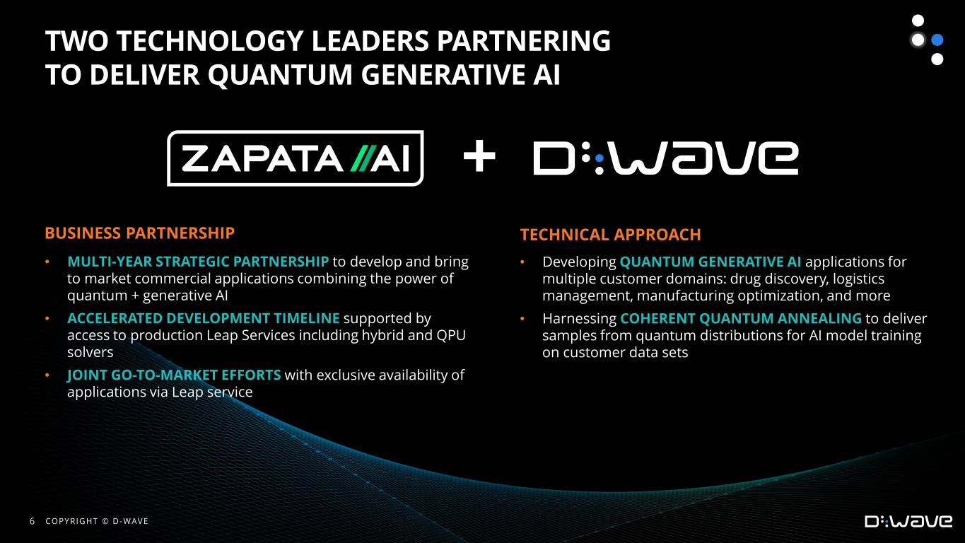 TWO TECHNOLOGY LEADERS PARTNERING TO DELIVER QUANTUM GENERATIVE AI • MULTI-YEAR STRATEGIC PARTNERSHIP to develop and bring to market commercial applications combining the power of quantum + generative AI • ACCELERATED DEVELOPMENT TIMELINE supported by access to production Leap Services including hybrid and QPU solvers • JOINT GO-TO-MARKET EFFORTS with exclusive availability of applications via Leap service BUSINESS PARTNERSHIP TECHNICAL APPROACH • Developing QUANTUM GENERATIVE AI applications for multiple customer domains: drug discovery, logistics management, manufacturing optimization, and more • Harnessing COHERENT QUANTUM ANNEALING to deliver samples from quantum distributions for AI model training on customer data sets 6 COPYRIGHT © D-WAVE