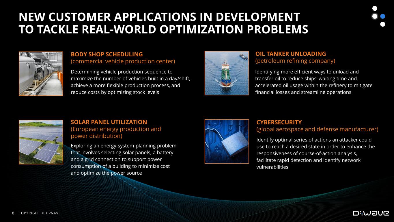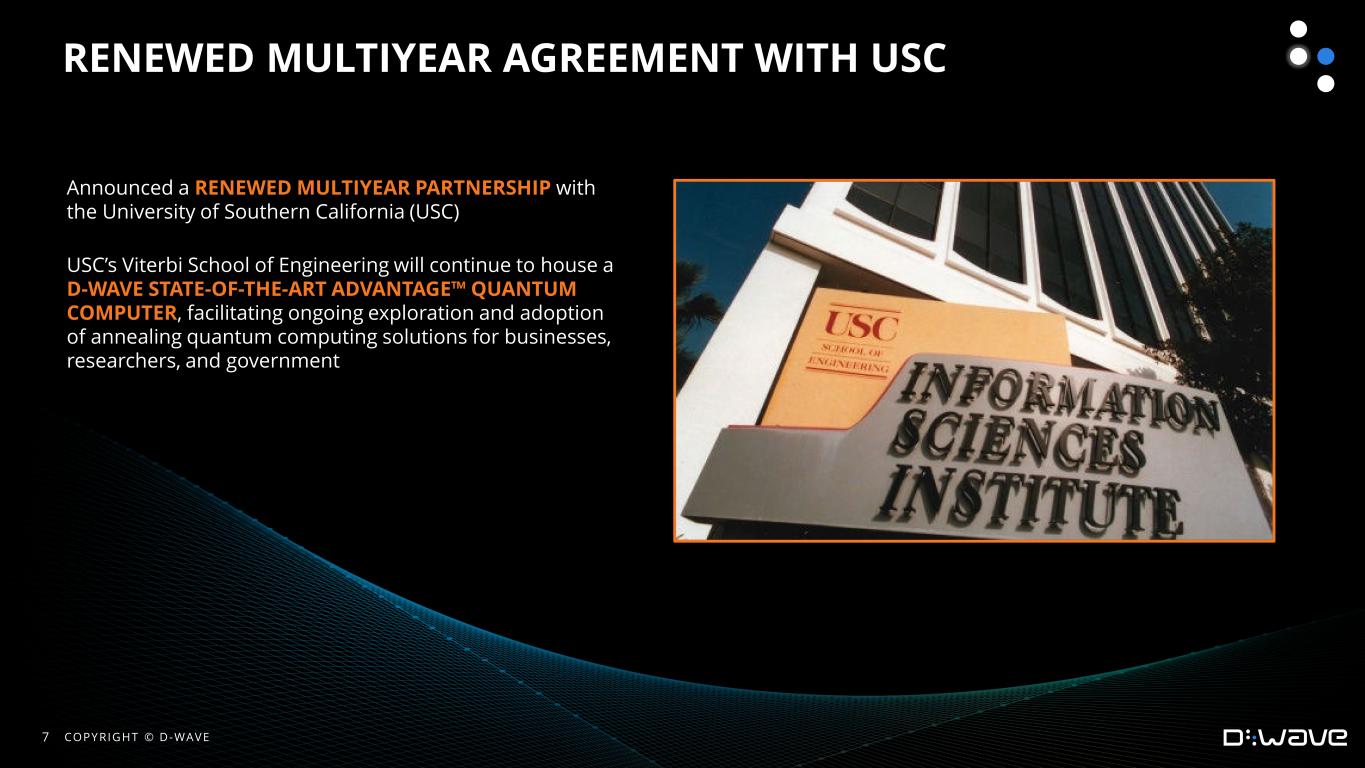 RENEWED MULTIYEAR AGREEMENT WITH USC Announced a RENEWED MULTIYEAR PARTNERSHIP with the University of Southern California (USC) USC’s Viterbi School of Engineering will continue to house a D-WAVE STATE-OF-THE-ART ADVANTAGE QUANTUM COMPUTER, facilitating ongoing exploration and adoption of annealing quantum computing solutions for businesses, researchers, and government 7 COPYRIGHT © D-WAVE