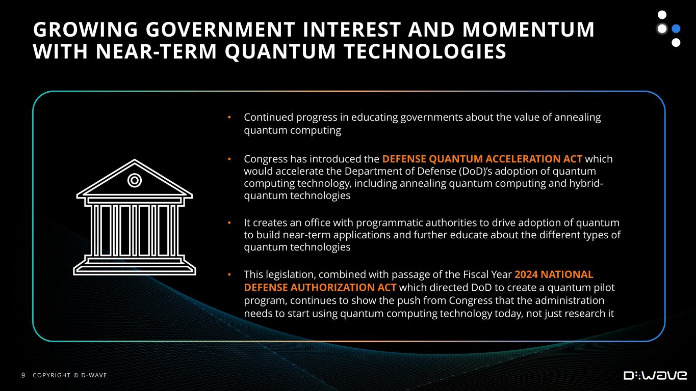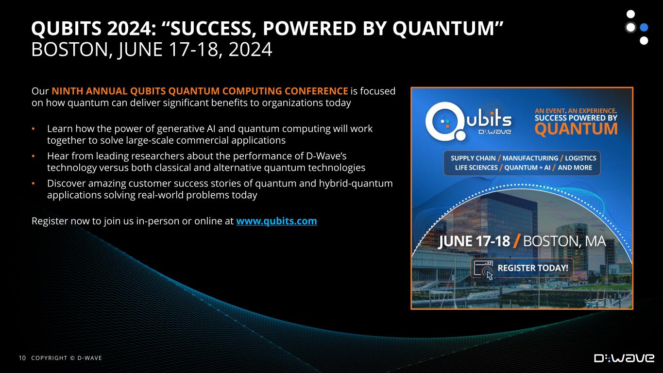 GROWING GOVERNMENT INTEREST AND MOMENTUM WITH NEAR-TERM QUANTUM TECHNOLOGIES • Continued progress in educating governments about the value of annealing quantum computing • Congress has introduced the DEFENSE QUANTUM ACCELERATION ACT which would accelerate the Department of Defense (DoD)’s adoption of quantum computing technology, including annealing quantum computing and hybrid- quantum technologies • It creates an office with programmatic authorities to drive adoption of quantum to build near-term applications and further educate about the different types of quantum technologies • This legislation, combined with passage of the Fiscal Year 2024 NATIONAL DEFENSE AUTHORIZATION ACT which directed DoD to create a quantum pilot program, continues to show the push from Congress that the administration needs to start using quantum computing technology today, not just research it 9 COPYRIGHT © D-WAVE