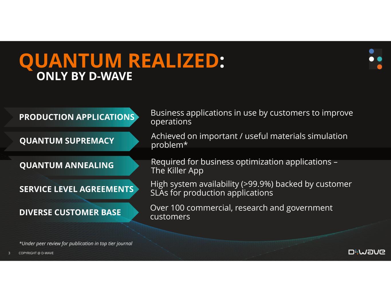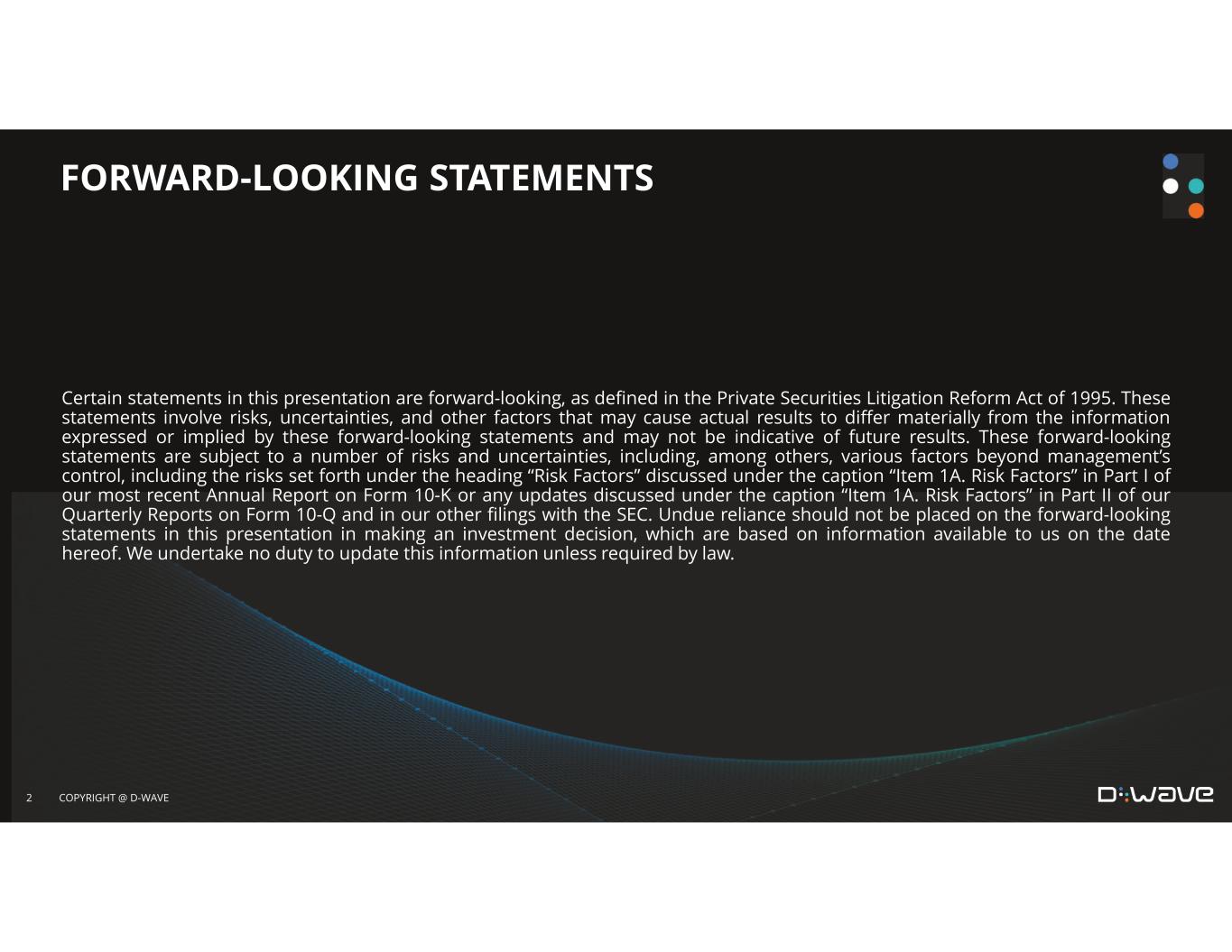 FORWARD-LOOKING STATEMENTS Certain statements in this presentation are forward-looking, as defined in the Private Securities Litigation Reform Act of 1995. These statements involve risks, uncertainties, and other factors that may cause actual results to differ materially from the information expressed or implied by these forward-looking statements and may not be indicative of future results. These forward-looking statements are subject to a number of risks and uncertainties, including, among others, various factors beyond management’s control, including the risks set forth under the heading “Risk Factors” discussed under the caption “Item 1A. Risk Factors” in Part I of our most recent Annual Report on Form 10-K or any updates discussed under the caption “Item 1A. Risk Factors” in Part II of our Quarterly Reports on Form 10-Q and in our other filings with the SEC. Undue reliance should not be placed on the forward-looking statements in this presentation in making an investment decision, which are based on information available to us on the date hereof. We undertake no duty to update this information unless required by law. COPYRIGHT @ D-WAVE2