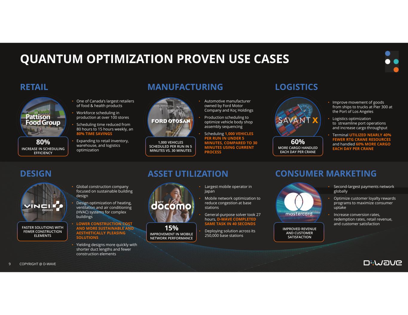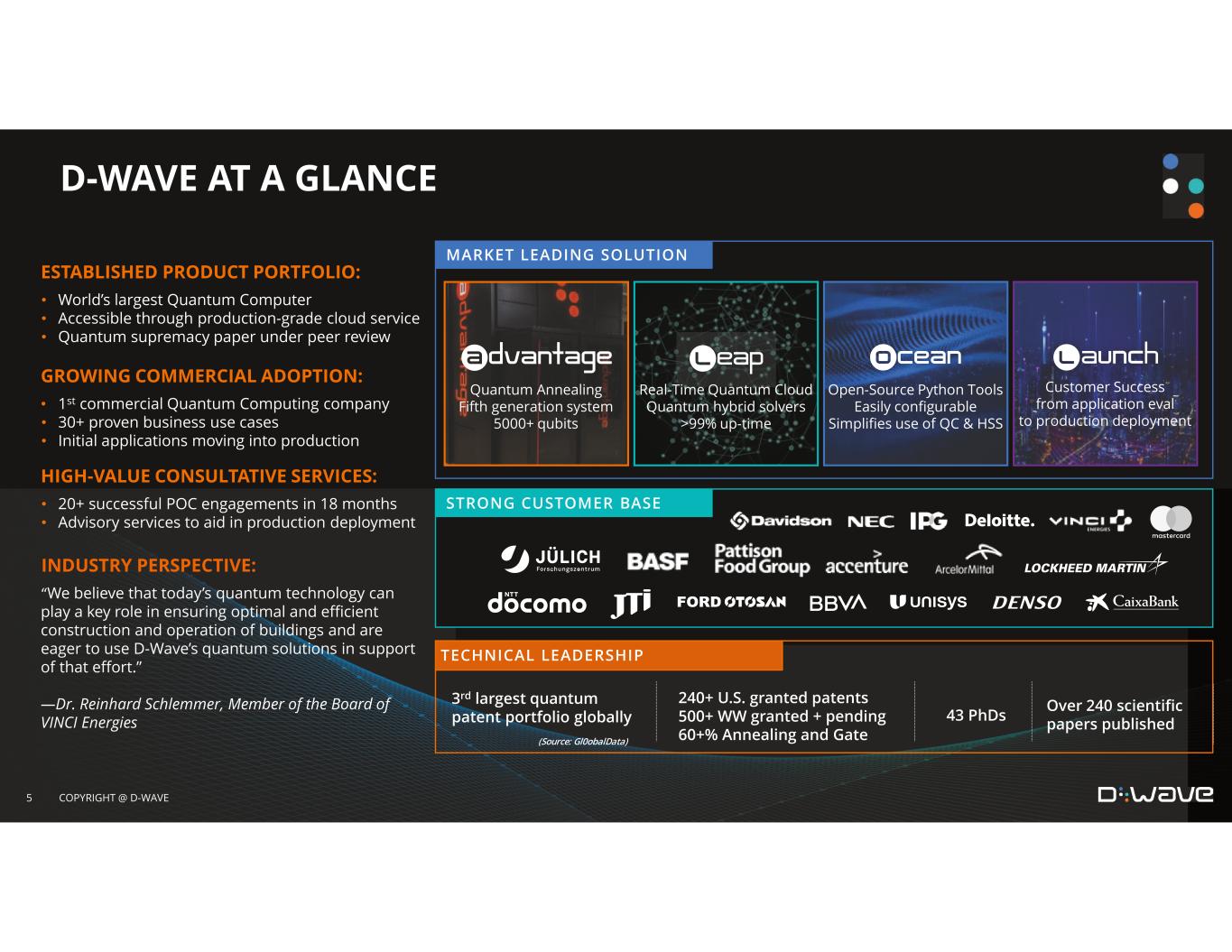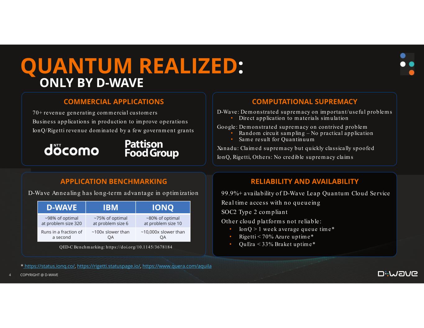 4 • TBD APPLICATION BENCHMARKING D-WAVE IBM IONQ ~98% of optimal at problem size 320 ~75% of optimal at problem size 6 ~80% of optimal at problem size 10 Runs in a fraction of a second ~100x slower than QA ~10,000x slower than QA D-Wave Annea ling has long-te rm advantage in op tim iza tion QED-C Benchm arking: h ttps://doi.org/10.1145/3678184 RELIABILITY AND AVAILABILITY 99.9%+ ava ilab ility of D-Wave Leap Quantum Cloud Se rvice Rea l tim e access with no queue ing SOC2 Type 2 com plian t Othe r cloud p la tform s not re liab le : • IonQ > 1 week ave rage queue tim e* • Rige tti < 70% Azure up tim e* • QuEra < 33% Brake t uptim e* COMPUTATIONAL SUPREMACY D-Wave : Dem onstra ted suprem acy on im portan t/use fu l p roblem s • Direct applica tion to m ate ria ls sim ula tion Google : Dem onstra ted suprem acy on contrived problem • Random circu it sam pling – No practica l applica tion • Sam e re su lt for Quantinuum Xanadu: Cla im ed suprem acy but qu ickly classica lly spoofed IonQ, Rige tti, Othe rs: No cred ib le suprem acy cla im s COPYRIGHT @ D-WAVE 70+ revenue gene ra ting com m ercia l custom ers Business applica tions in production to im prove ope ra tions IonQ/Rige tti revenue dom ina ted by a few gove rnm ent gran ts COMMERCIAL APPLICATIONS QUANTUM REALIZED: ONLY BY D-WAVE * https://status.ionq.co/, https://rigetti.statuspage.io/, https://www.quera.com/aquila