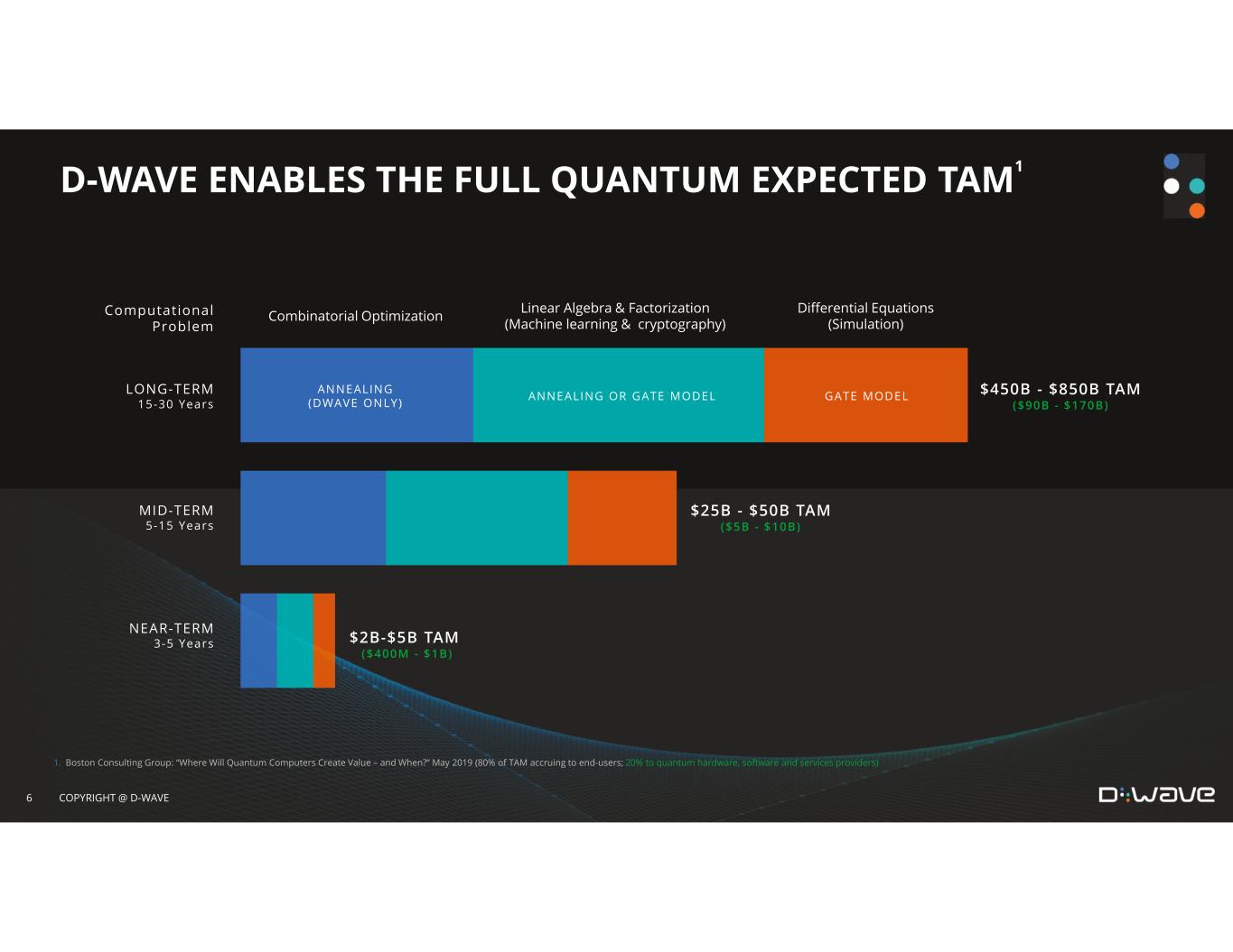 MARKET LEADING SOLUTION STRONG CUSTOMER BASE TECHNICAL LEADERSHIP 3rd largest quantum patent portfolio globally 43 PhDs 240+ U.S. granted patents 500+ WW granted + pending 60+% Annealing and Gate Over 240 scientific papers published Quantum Annealing Fifth generation system 5000+ qubits Real-Time Quantum Cloud Quantum hybrid solvers >99% up-time Open-Source Python Tools Easily configurable Simplifies use of QC & HSS Customer Success from application eval to production deployment (Source: Gl0obalData) D-WAVE AT A GLANCE COPYRIGHT @ D-WAVE5 ESTABLISHED PRODUCT PORTFOLIO: • World’s largest Quantum Computer • Accessible through production-grade cloud service • Quantum supremacy paper under peer review GROWING COMMERCIAL ADOPTION: • 1st commercial Quantum Computing company • 30+ proven business use cases • Initial applications moving into production HIGH-VALUE CONSULTATIVE SERVICES: • 20+ successful POC engagements in 18 months • Advisory services to aid in production deployment INDUSTRY PERSPECTIVE: “We believe that today’s quantum technology can play a key role in ensuring optimal and efficient construction and operation of buildings and are eager to use D-Wave’s quantum solutions in support of that effort.” —Dr. Reinhard Schlemmer, Member of the Board of VINCI Energies