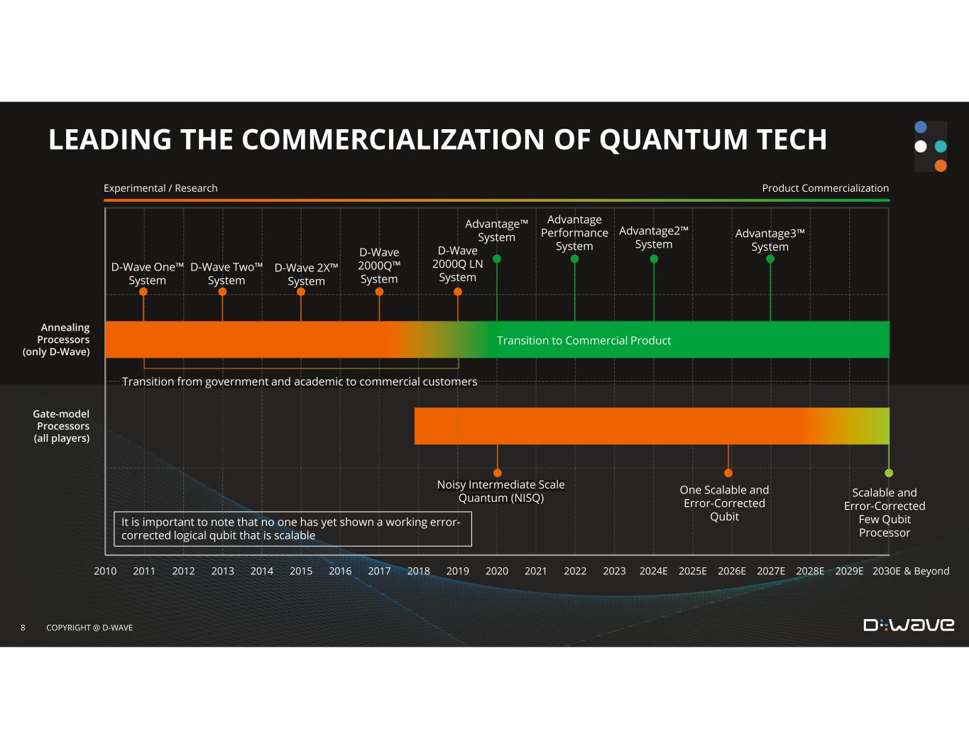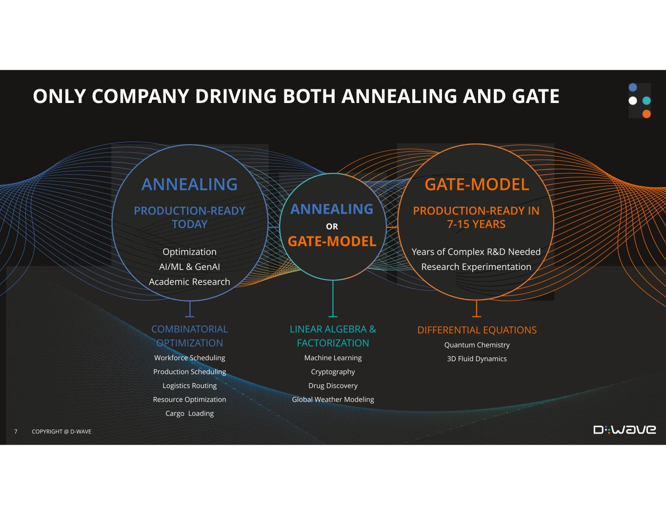 ONLY COMPANY DRIVING BOTH ANNEALING AND GATE COPYRIGHT @ D-WAVE7 PRODUCTION-READY TODAY ANNEALING Optimization AI/ML & GenAI Academic Research GATE-MODEL PRODUCTION-READY IN 7-15 YEARS Years of Complex R&D Needed Research Experimentation COMBINATORIAL OPTIMIZATION Workforce Scheduling Production Scheduling Logistics Routing Resource Optimization Cargo Loading DIFFERENTIAL EQUATIONS Quantum Chemistry 3D Fluid Dynamics LINEAR ALGEBRA & FACTORIZATION Machine Learning Cryptography Drug Discovery Global Weather Modeling ANNEALING OR GATE-MODEL