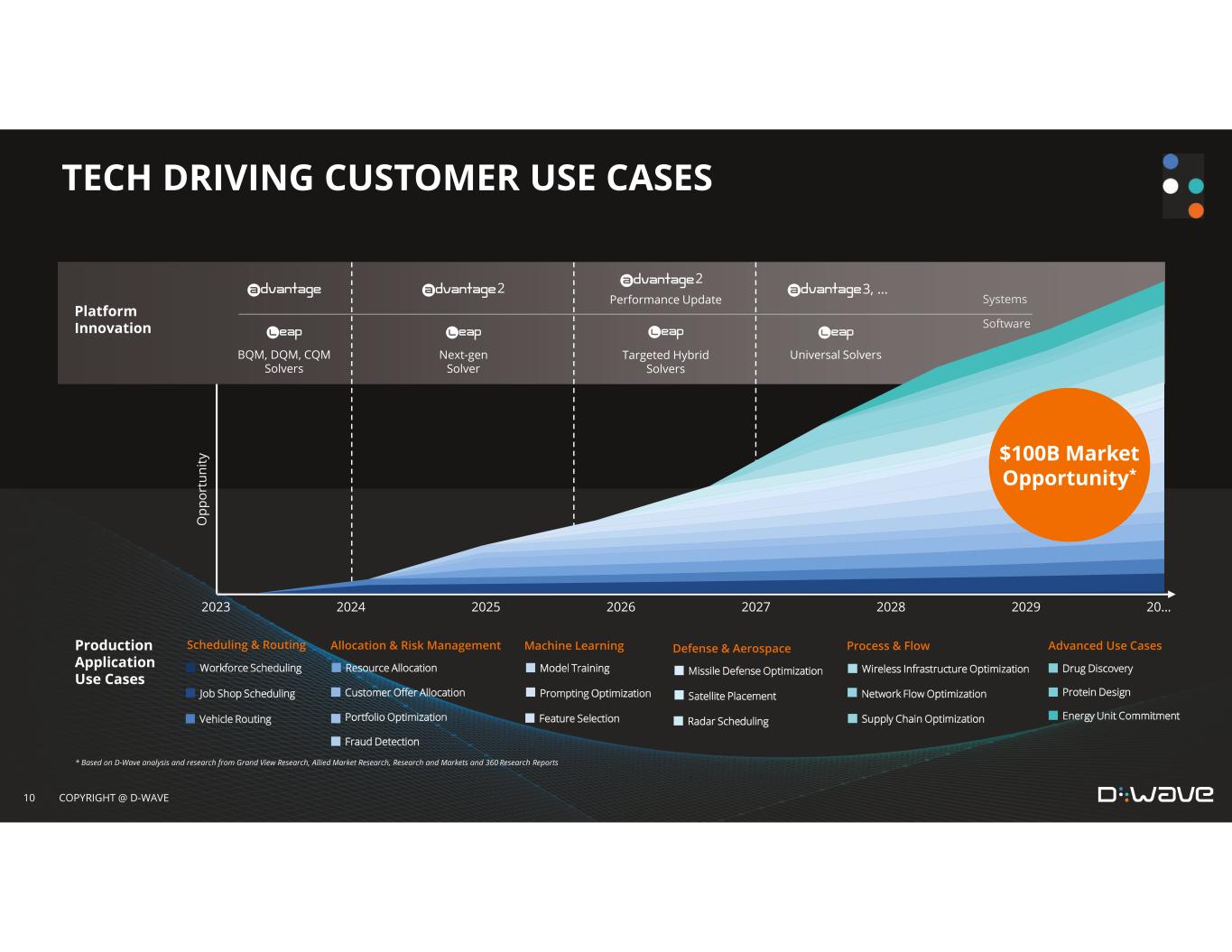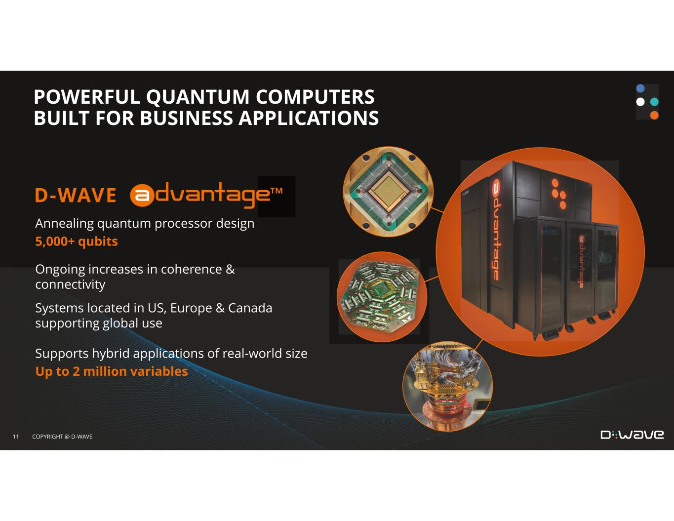 TECH DRIVING CUSTOMER USE CASES O pp or tu ni ty 2023 20262024 20… Workforce Scheduling Job Shop Scheduling Vehicle Routing Scheduling & Routing Wireless Infrastructure Optimization Network Flow Optimization Supply Chain Optimization Process & Flow Model Training Prompting Optimization Feature Selection Machine Learning Drug Discovery Protein Design Advanced Use Cases Energy Unit Commitment Production Application Use Cases 20282025 2027 2029 Missile Defense Optimization Satellite Placement Radar Scheduling Defense & Aerospace Resource Allocation Customer Offer Allocation Portfolio Optimization Allocation & Risk Management Fraud Detection BQM, DQM, CQM Solvers Next-gen Solver 2 Universal Solvers 3, … Platform Innovation Targeted Hybrid Solvers Performance Update 2 Systems Software * Based on D-Wave analysis and research from Grand View Research, Allied Market Research, Research and Markets and 360 Research Reports COPYRIGHT @ D-WAVE10 $100B Market Opportunity*