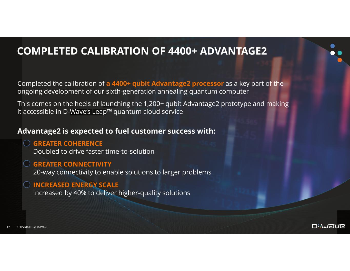 COMPLETED CALIBRATION OF 4400+ ADVANTAGE2 Completed the calibration of a 4400+ qubit Advantage2 processor as a key part of the ongoing development of our sixth-generation annealing quantum computer This comes on the heels of launching the 1,200+ qubit Advantage2 prototype and making it accessible in D-Wave’s Leap quantum cloud service GREATER COHERENCE Doubled to drive faster time-to-solution GREATER CONNECTIVITY 20-way connectivity to enable solutions to larger problems INCREASED ENERGY SCALE Increased by 40% to deliver higher-quality solutions Advantage2 is expected to fuel customer success with: COPYRIGHT @ D-WAVE12