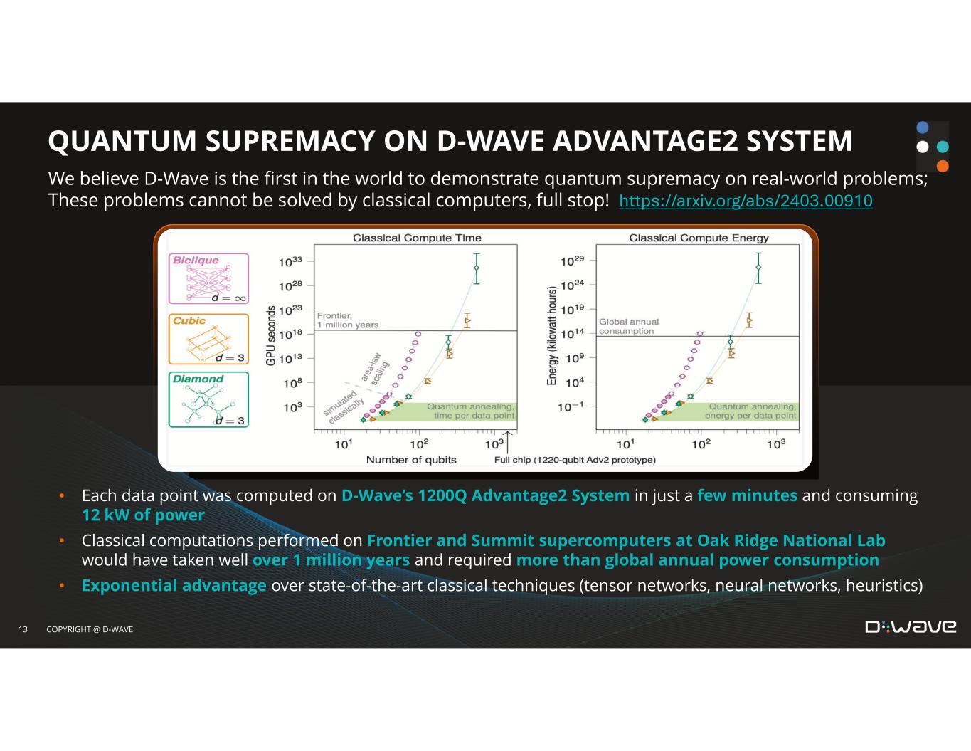 QUANTUM SUPREMACY ON D-WAVE ADVANTAGE2 SYSTEM • Each data point was computed on D-Wave’s 1200Q Advantage2 System in just a few minutes and consuming 12 kW of power • Classical computations performed on Frontier and Summit supercomputers at Oak Ridge National Lab would have taken well over 1 million years and required more than global annual power consumption • Exponential advantage over state-of-the-art classical techniques (tensor networks, neural networks, heuristics) We believe D-Wave is the first in the world to demonstrate quantum supremacy on real-world problems; These problems cannot be solved by classical computers, full stop! https://arxiv.org/abs/2403.00910 COPYRIGHT @ D-WAVE13