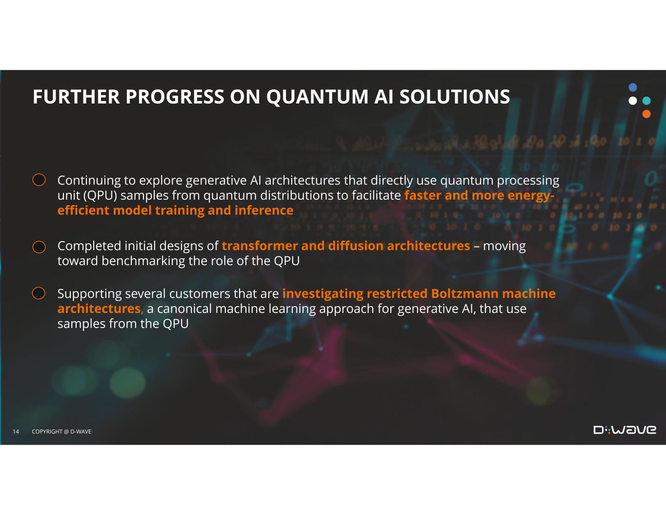 FURTHER PROGRESS ON QUANTUM AI SOLUTIONS Continuing to explore generative AI architectures that directly use quantum processing unit (QPU) samples from quantum distributions to facilitate faster and more energy- efficient model training and inference Completed initial designs of transformer and diffusion architectures – moving toward benchmarking the role of the QPU Supporting several customers that are investigating restricted Boltzmann machine architectures, a canonical machine learning approach for generative AI, that use samples from the QPU COPYRIGHT @ D-WAVE14