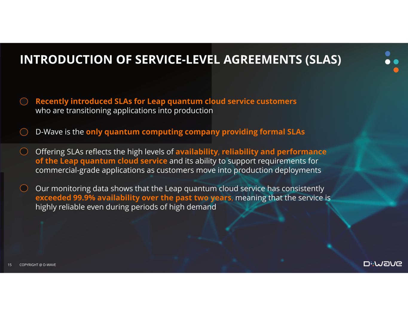 INTRODUCTION OF SERVICE-LEVEL AGREEMENTS (SLAS) Recently introduced SLAs for Leap quantum cloud service customers who are transitioning applications into production D-Wave is the only quantum computing company providing formal SLAs Offering SLAs reflects the high levels of availability, reliability and performance of the Leap quantum cloud service and its ability to support requirements for commercial-grade applications as customers move into production deployments Our monitoring data shows that the Leap quantum cloud service has consistently exceeded 99.9% availability over the past two years, meaning that the service is highly reliable even during periods of high demand COPYRIGHT @ D-WAVE15