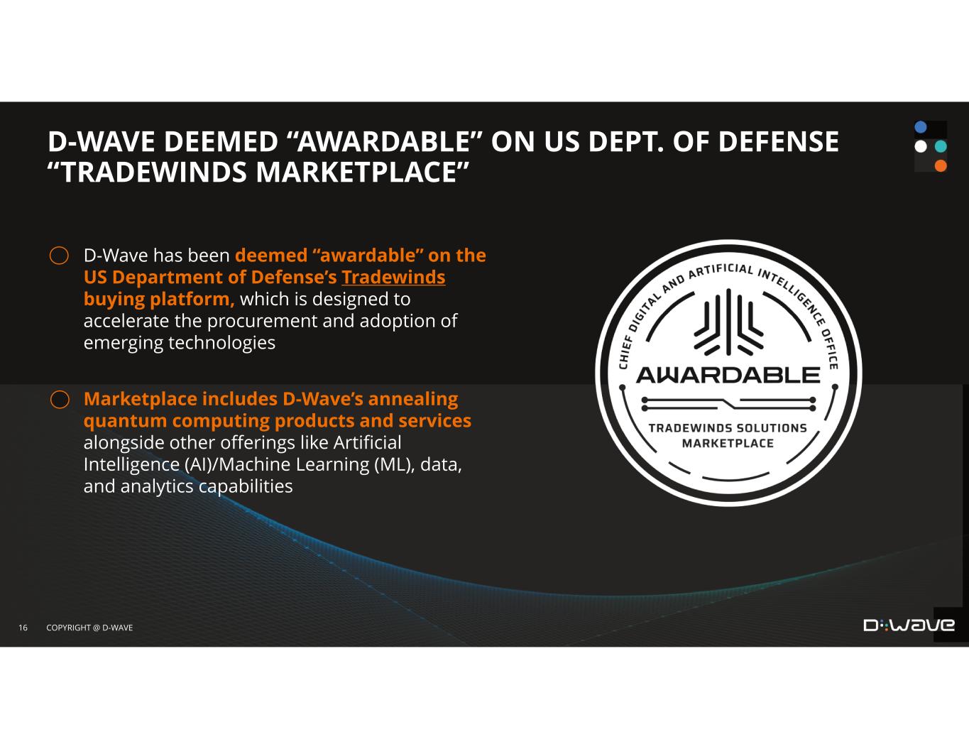 D-WAVE DEEMED “AWARDABLE” ON US DEPT. OF DEFENSE “TRADEWINDS MARKETPLACE” D-Wave has been deemed “awardable” on the US Department of Defense’s Tradewinds buying platform, which is designed to accelerate the procurement and adoption of emerging technologies Marketplace includes D-Wave’s annealing quantum computing products and services alongside other offerings like Artificial Intelligence (AI)/Machine Learning (ML), data, and analytics capabilities COPYRIGHT @ D-WAVE16