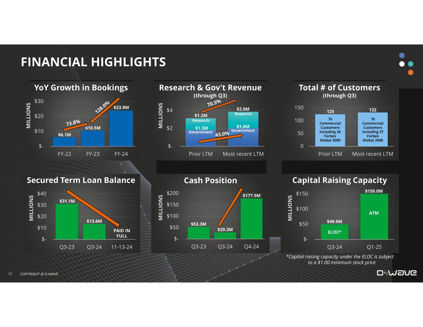 FINANCIAL HIGHLIGHTS COPYRIGHT @ D-WAVE17 0 50 100 150 Prior LTM Most recent LTM 125 Total # of Customers 132 75 Commercial Customers including 26 Forbes Global 2000 76 Commercial Customers including 27 Forbes Global 2000 $- $2 $4 $6 $8 Q3 2023 Q3 2024 M IL LI O N S $5.8M First 9 Months Revenue $6.5M $- $2 $4 Prior LTM Most recent LTM M IL LI O N S - $1.2M Research & Gov’t Revenue (through Q3) Government $1.8M Government Research Research $2.0M $1.3M $- $10 $20 $30 $40 Q3-23 Q3-24 11-13-24 M IL LI O N S PAID IN FULL $31.1M Secured Term Loan Balance $13.6M $- $50 $100 $150 Q3-24 Q1-25 M IL LI O N S $49.9M $150.0M Capital Raising Capacity ELOC* ATM $- $50 $100 $150 $200 Q3-23 Q3-24 Q4-24 M IL LI O N S $53.3M $29.3M $177.9M Cash Position ri r st r c t 125 t l f st rs (through Q3) 132 75 Co ercial Custo ers including 26 Forbes Global 2000 76 Co ercial Custo ers including 27 Forbes Global 2000 M IL LI O N S $10 $20 $30 FY-22 FY-23 FY-24 M IL LI O N S $10.5M YoY Growth in Bookings $23.9M *Capital raising capacity under the ELOC is subject to a $1.00 minimum stock price $6.1M