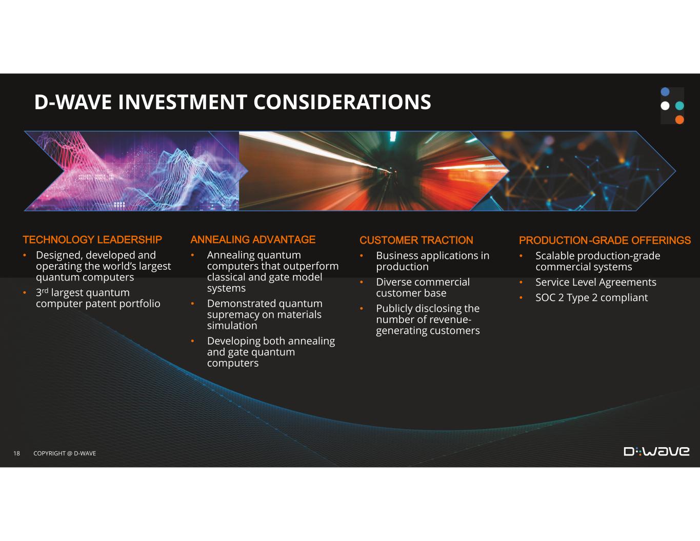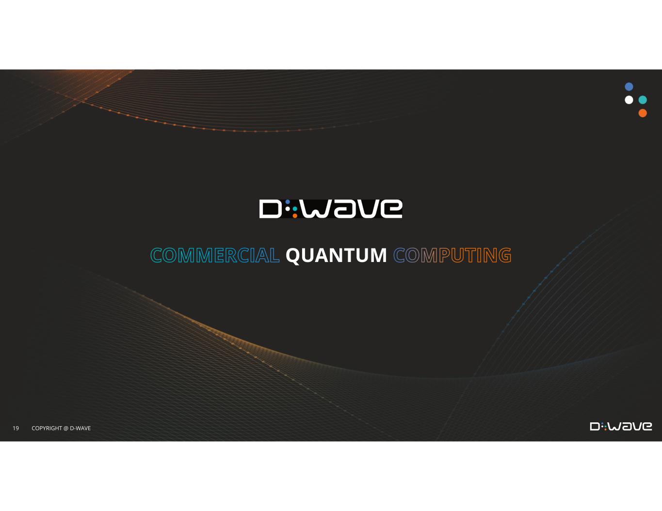 D-WAVE INVESTMENT CONSIDERATIONS COPYRIGHT @ D-WAVE18 TECHNOLOGY LEADERSHIP • Designed, developed and operating the world’s largest quantum computers • 3rd largest quantum computer patent portfolio ANNEALING ADVANTAGE • Annealing quantum computers that outperform classical and gate model systems • Demonstrated quantum supremacy on materials simulation • Developing both annealing and gate quantum computers CUSTOMER TRACTION • Business applications in production • Diverse commercial customer base • Publicly disclosing the number of revenue- generating customers PRODUCTION-GRADE OFFERINGS • Scalable production-grade commercial systems • Service Level Agreements • SOC 2 Type 2 compliant