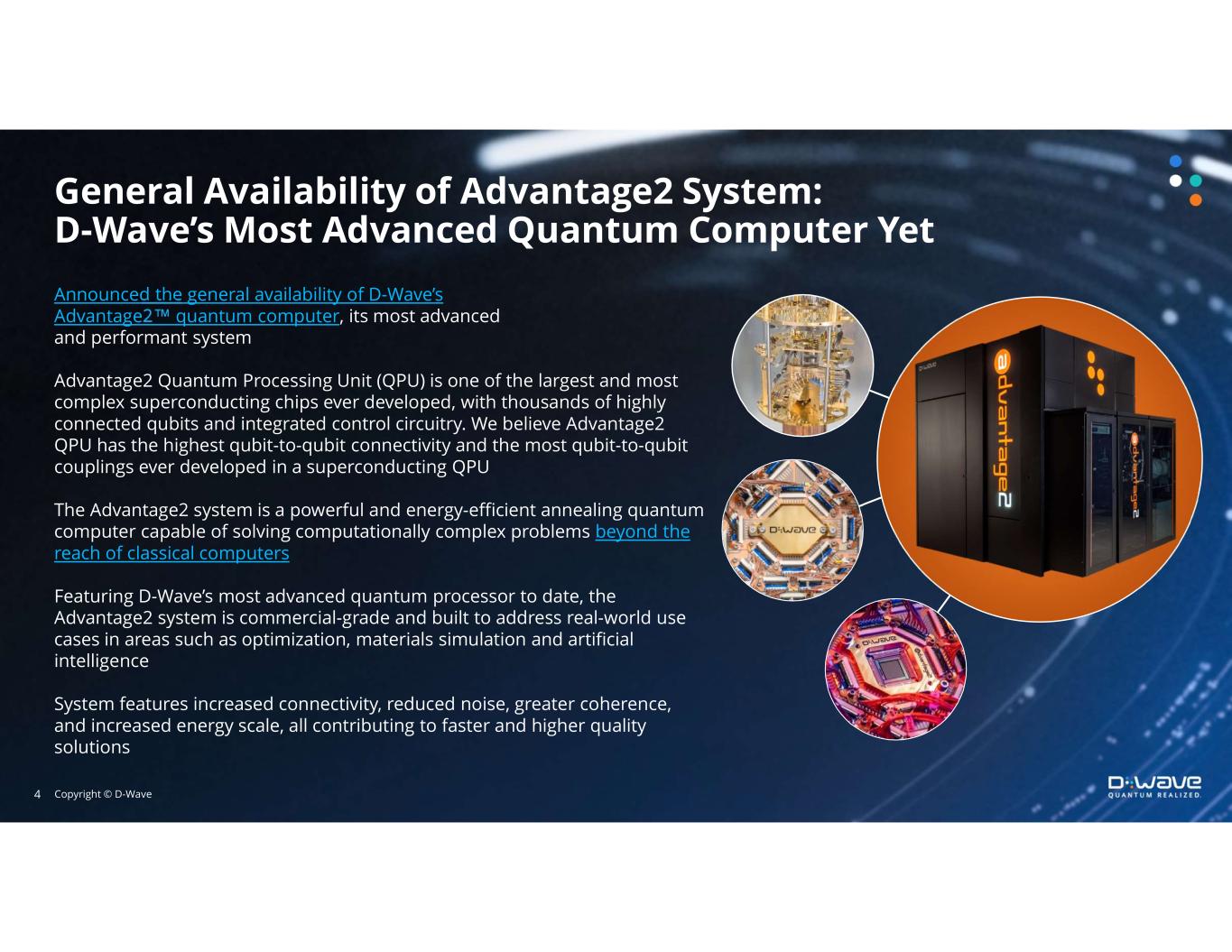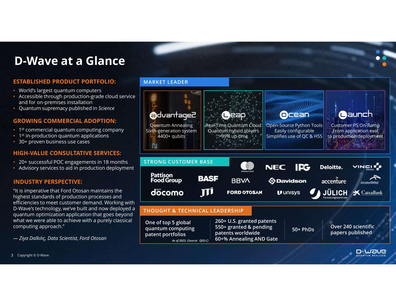 2 Copyright © D-Wave Forward-Looking Statements Certain statements in this presentation are forward-looking, as defined in the Private Securities Litigation Reform Act of 1995. These statements involve risks, uncertainties, and other factors that may cause actual results to differ materially from the information expressed or implied by these forward-looking statements and may not be indicative of future results. These forward-looking statements are subject to a number of risks and uncertainties, including, among others, various factors beyond management’s control, including the risks set forth under the heading “Risk Factors” discussed under the caption “Item 1A. Risk Factors” in Part I of our most recent Annual Report on Form 10-K or any updates discussed under the caption “Item 1A. Risk Factors” in Part II of our Quarterly Reports on Form 10-Q and in our other filings with the SEC. Undue reliance should not be placed on the forward-looking statements in this presentation, which are based on information available to us on the date hereof. We undertake no duty to update this information unless required by law.
