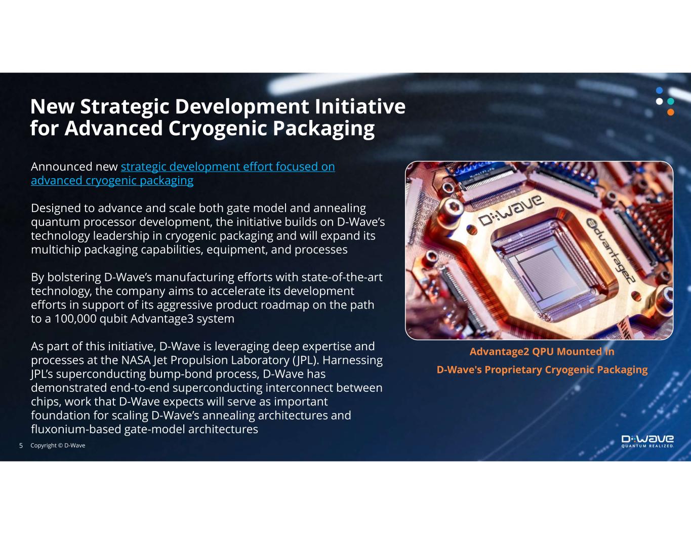 4 Copyright © D-Wave General Availability of Advantage2 System: D-Wave’s Most Advanced Quantum Computer Yet Announced the general availability of D-Wave’s Advantage2 quantum computer, its most advanced and performant system Advantage2 Quantum Processing Unit (QPU) is one of the largest and most complex superconducting chips ever developed, with thousands of highly connected qubits and integrated control circuitry. We believe Advantage2 QPU has the highest qubit-to-qubit connectivity and the most qubit-to-qubit couplings ever developed in a superconducting QPU The Advantage2 system is a powerful and energy-efficient annealing quantum computer capable of solving computationally complex problems beyond the reach of classical computers Featuring D-Wave’s most advanced quantum processor to date, the Advantage2 system is commercial-grade and built to address real-world use cases in areas such as optimization, materials simulation and artificial intelligence System features increased connectivity, reduced noise, greater coherence, and increased energy scale, all contributing to faster and higher quality solutions