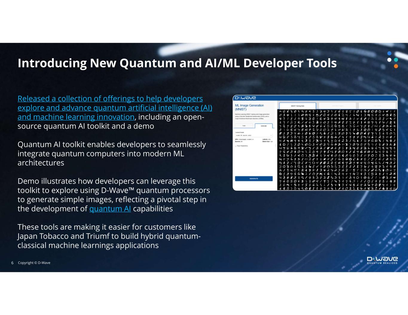 6 Copyright © D-Wave Introducing New Quantum and AI/ML Developer Tools Released a collection of offerings to help developers explore and advance quantum artificial intelligence (AI) and machine learning innovation, including an open- source quantum AI toolkit and a demo Quantum AI toolkit enables developers to seamlessly integrate quantum computers into modern ML architectures Demo illustrates how developers can leverage this toolkit to explore using D-Wave quantum processors to generate simple images, reflecting a pivotal step in the development of quantum AI capabilities These tools are making it easier for customers like Japan Tobacco and Triumf to build hybrid quantum- classical machine learnings applications