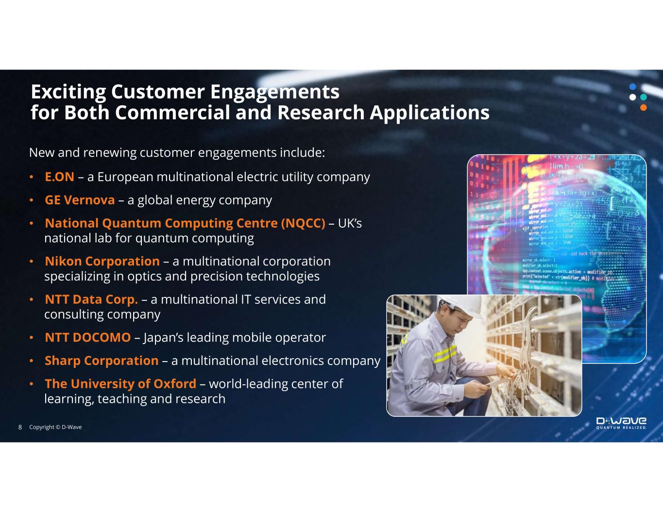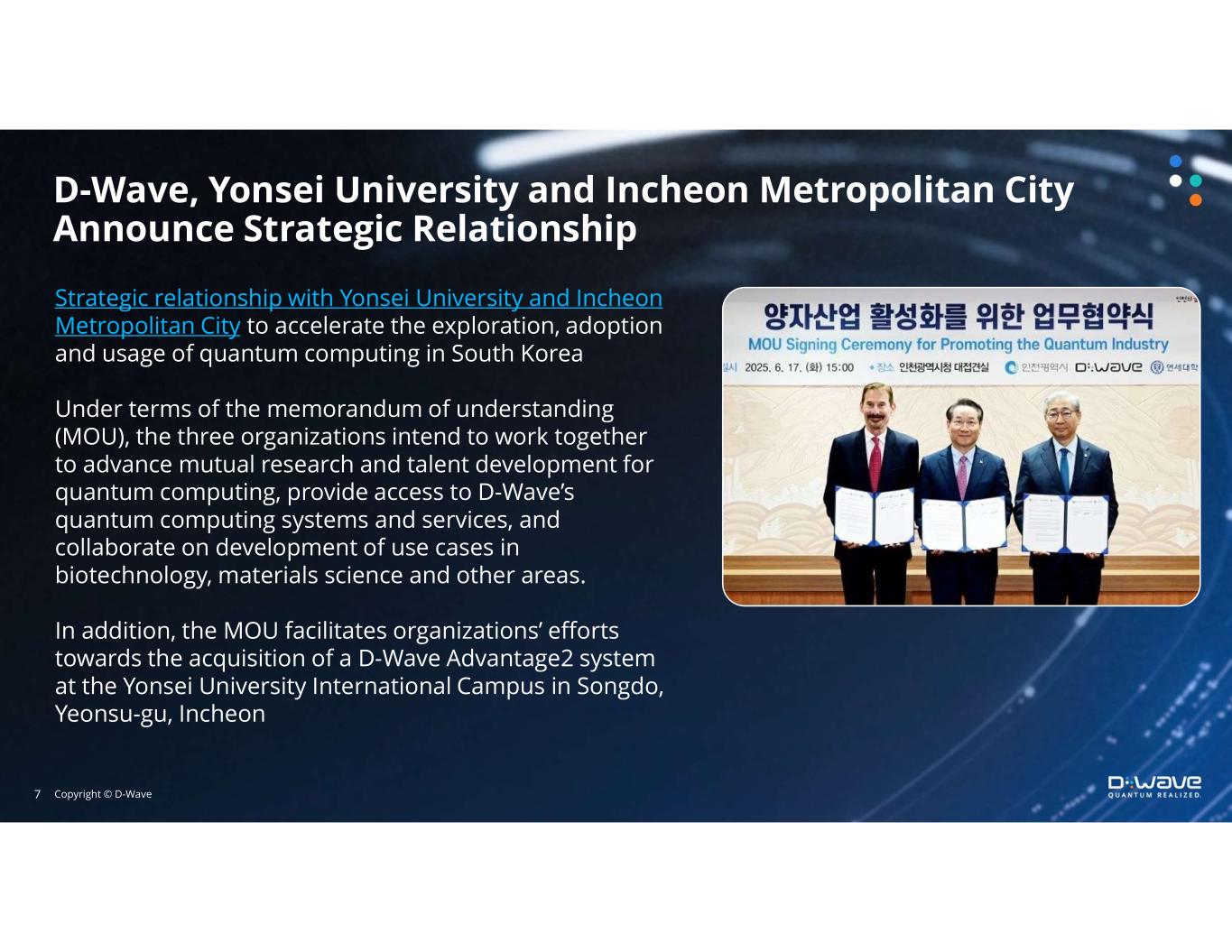 7 Copyright © D-Wave D-Wave, Yonsei University and Incheon Metropolitan City Announce Strategic Relationship Strategic relationship with Yonsei University and Incheon Metropolitan City to accelerate the exploration, adoption and usage of quantum computing in South Korea Under terms of the memorandum of understanding (MOU), the three organizations intend to work together to advance mutual research and talent development for quantum computing, provide access to D-Wave’s quantum computing systems and services, and collaborate on development of use cases in biotechnology, materials science and other areas. In addition, the MOU facilitates organizations’ efforts towards the acquisition of a D-Wave Advantage2 system at the Yonsei University International Campus in Songdo, Yeonsu-gu, Incheon
