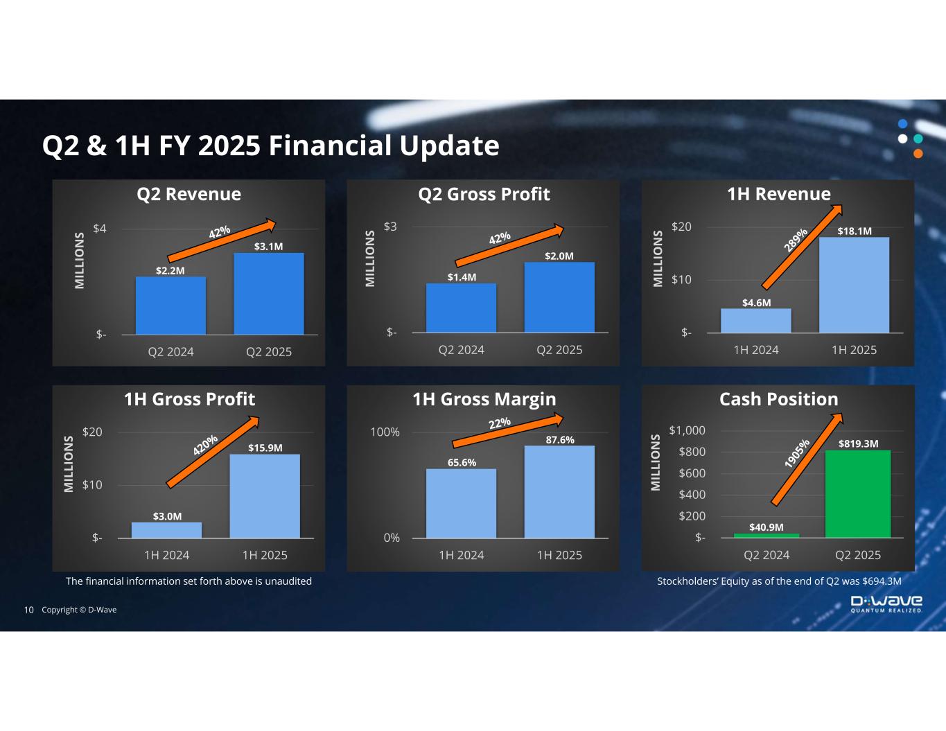 9 Copyright © D-Wave D-Wave Announces Successful Completion of $400 Million At-the-Market Equity Offering Completed a successful $400 million At-the-Market equity offering, contributing to D-Wave’s consolidated cash balance of approximately $819 million as of June 30, 2025, a record quarter-end balance for the Company Company intends to use the proceeds from this financing primarily for strategic acquisitions and general corporate purposes including providing additional working capital and funding capital expenditures
