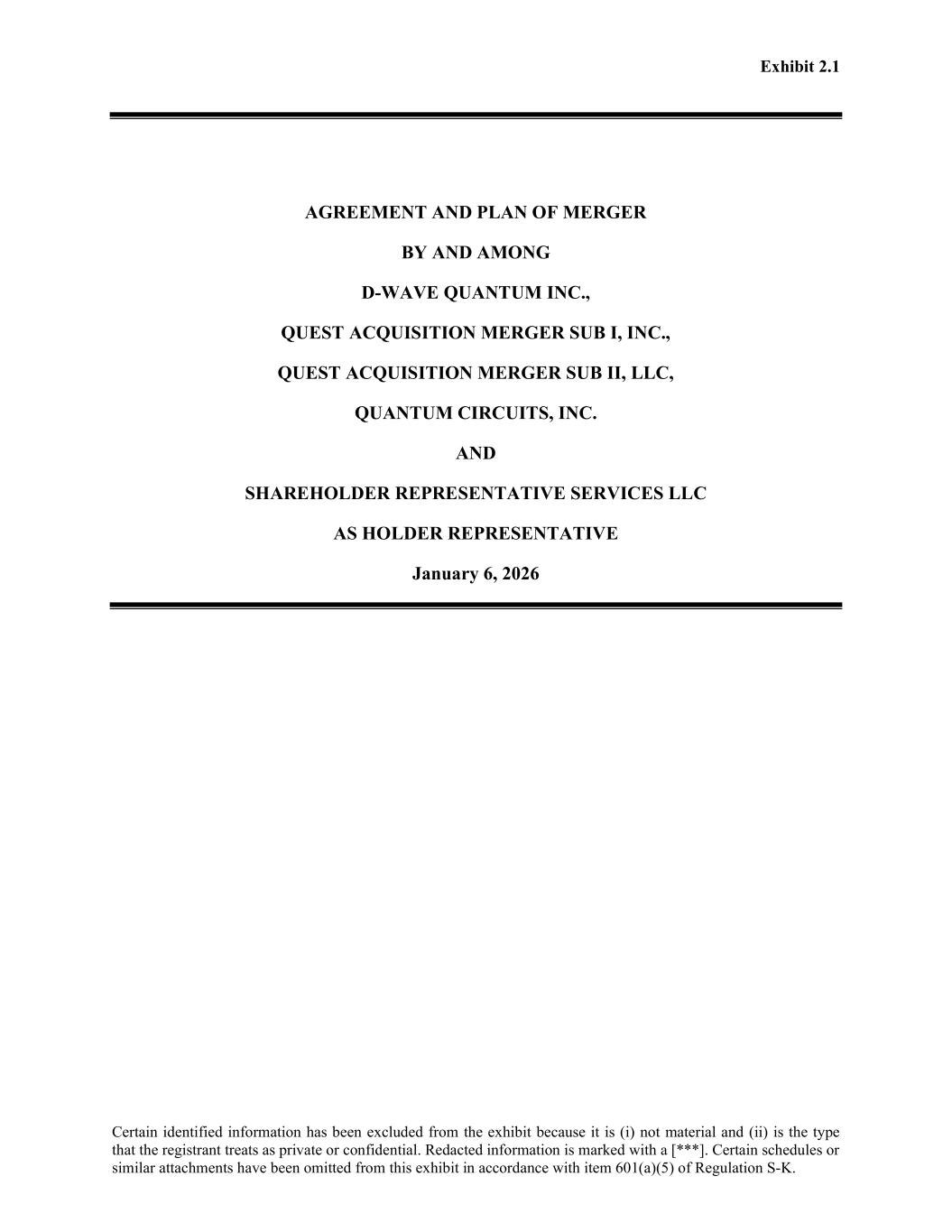 Exhibit 2.1 Certain identified information has been excluded from the exhibit because it is (i) not material and (ii) is the type that the registrant treats as private or confidential. Redacted information is marked with a [***]. Certain schedules or similar attachments have been omitted from this exhibit in accordance with item 601(a)(5) of Regulation S-K. AGREEMENT AND PLAN OF MERGER BY AND AMONG D-WAVE QUANTUM INC., QUEST ACQUISITION MERGER SUB I, INC., QUEST ACQUISITION MERGER SUB II, LLC, QUANTUM CIRCUITS, INC. AND SHAREHOLDER REPRESENTATIVE SERVICES LLC AS HOLDER REPRESENTATIVE January 6, 2026