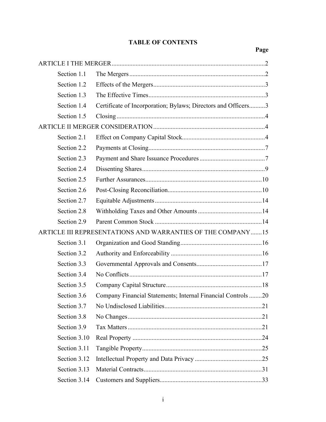 i TABLE OF CONTENTS Page ARTICLE I THE MERGER ................................................................................................ 2 Section 1.1 The Mergers ..................................................................................... 2 Section 1.2 Effects of the Mergers ...................................................................... 3 Section 1.3 The Effective Times ......................................................................... 3 Section 1.4 Certificate of Incorporation; Bylaws; Directors and Officers.......... 3 Section 1.5 Closing ............................................................................................. 4 ARTICLE II MERGER CONSIDERATION ...................................................................... 4 Section 2.1 Effect on Company Capital Stock.................................................... 4 Section 2.2 Payments at Closing ......................................................................... 7 Section 2.3 Payment and Share Issuance Procedures ......................................... 7 Section 2.4 Dissenting Shares ............................................................................. 9 Section 2.5 Further Assurances......................................................................... 10 Section 2.6 Post-Closing Reconciliation........................................................... 10 Section 2.7 Equitable Adjustments ................................................................... 14 Section 2.8 Withholding Taxes and Other Amounts ........................................ 14 Section 2.9 Parent Common Stock ................................................................... 14 ARTICLE III REPRESENTATIONS AND WARRANTIES OF THE COMPANY ....... 15 Section 3.1 Organization and Good Standing ................................................... 16 Section 3.2 Authority and Enforceability ......................................................... 16 Section 3.3 Governmental Approvals and Consents......................................... 17 Section 3.4 No Conflicts ................................................................................... 17 Section 3.5 Company Capital Structure ............................................................ 18 Section 3.6 Company Financial Statements; Internal Financial Controls ........ 20 Section 3.7 No Undisclosed Liabilities ............................................................. 21 Section 3.8 No Changes .................................................................................... 21 Section 3.9 Tax Matters .................................................................................... 21 Section 3.10 Real Property ................................................................................. 24 Section 3.11 Tangible Property........................................................................... 25 Section 3.12 Intellectual Property and Data Privacy .......................................... 25 Section 3.13 Material Contracts .......................................................................... 31 Section 3.14 Customers and Suppliers................................................................ 33