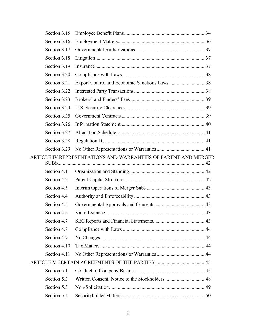 ii Section 3.15 Employee Benefit Plans. ................................................................ 34 Section 3.16 Employment Matters ...................................................................... 36 Section 3.17 Governmental Authorizations ........................................................ 37 Section 3.18 Litigation ........................................................................................ 37 Section 3.19 Insurance ........................................................................................ 37 Section 3.20 Compliance with Laws .................................................................. 38 Section 3.21 Export Control and Economic Sanctions Laws ............................. 38 Section 3.22 Interested Party Transactions ......................................................... 38 Section 3.23 Brokers’ and Finders’ Fees ............................................................ 39 Section 3.24 U.S. Security Clearances................................................................ 39 Section 3.25 Government Contracts ................................................................... 39 Section 3.26 Information Statement ................................................................... 40 Section 3.27 Allocation Schedule ....................................................................... 41 Section 3.28 Regulation D .................................................................................. 41 Section 3.29 No Other Representations or Warranties ....................................... 41 ARTICLE IV REPRESENTATIONS AND WARRANTIES OF PARENT AND MERGER SUBS...................................................................................................................... 42 Section 4.1 Organization and Standing ............................................................. 42 Section 4.2 Parent Capital Structure ................................................................. 42 Section 4.3 Interim Operations of Merger Subs ............................................... 43 Section 4.4 Authority and Enforceability ......................................................... 43 Section 4.5 Governmental Approvals and Consents......................................... 43 Section 4.6 Valid Issuance ................................................................................ 43 Section 4.7 SEC Reports and Financial Statements.......................................... 43 Section 4.8 Compliance with Laws .................................................................. 44 Section 4.9 No Changes .................................................................................... 44 Section 4.10 Tax Matters .................................................................................... 44 Section 4.11 No Other Representations or Warranties ....................................... 44 ARTICLE V CERTAIN AGREEMENTS OF THE PARTIES ........................................ 45 Section 5.1 Conduct of Company Business ...................................................... 45 Section 5.2 Written Consent; Notice to the Stockholders................................. 48 Section 5.3 Non-Solicitation ............................................................................. 49 Section 5.4 Securityholder Matters ................................................................... 50