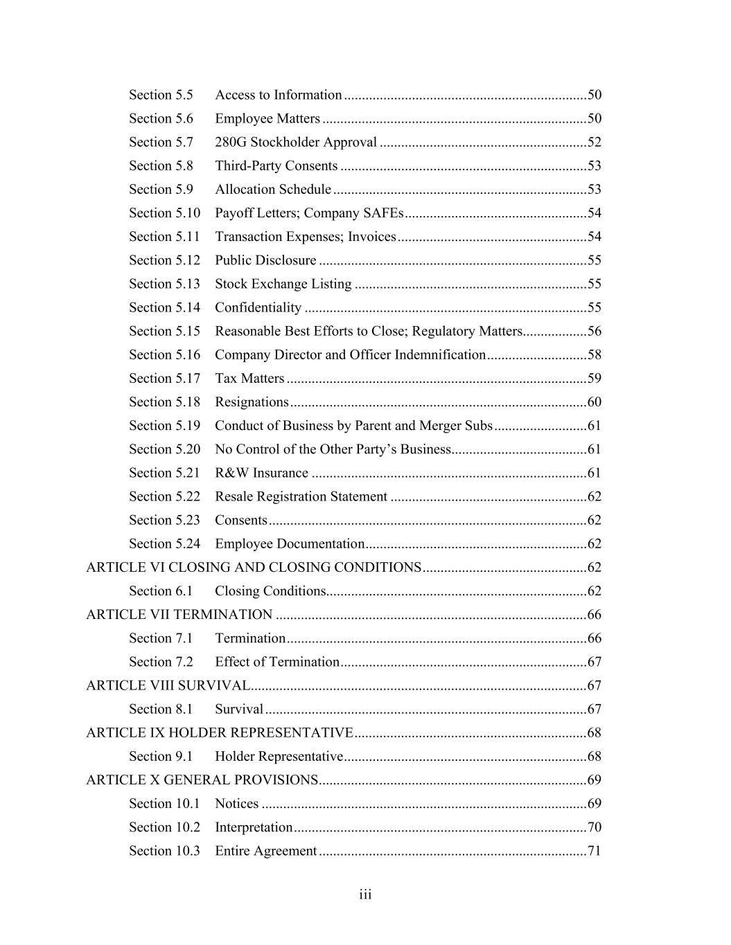 iii Section 5.5 Access to Information .................................................................... 50 Section 5.6 Employee Matters .......................................................................... 50 Section 5.7 280G Stockholder Approval .......................................................... 52 Section 5.8 Third-Party Consents ..................................................................... 53 Section 5.9 Allocation Schedule ....................................................................... 53 Section 5.10 Payoff Letters; Company SAFEs ................................................... 54 Section 5.11 Transaction Expenses; Invoices ..................................................... 54 Section 5.12 Public Disclosure ........................................................................... 55 Section 5.13 Stock Exchange Listing ................................................................. 55 Section 5.14 Confidentiality ............................................................................... 55 Section 5.15 Reasonable Best Efforts to Close; Regulatory Matters.................. 56 Section 5.16 Company Director and Officer Indemnification ............................ 58 Section 5.17 Tax Matters .................................................................................... 59 Section 5.18 Resignations ................................................................................... 60 Section 5.19 Conduct of Business by Parent and Merger Subs .......................... 61 Section 5.20 No Control of the Other Party’s Business...................................... 61 Section 5.21 R&W Insurance ............................................................................. 61 Section 5.22 Resale Registration Statement ....................................................... 62 Section 5.23 Consents ......................................................................................... 62 Section 5.24 Employee Documentation .............................................................. 62 ARTICLE VI CLOSING AND CLOSING CONDITIONS .............................................. 62 Section 6.1 Closing Conditions......................................................................... 62 ARTICLE VII TERMINATION ....................................................................................... 66 Section 7.1 Termination .................................................................................... 66 Section 7.2 Effect of Termination ..................................................................... 67 ARTICLE VIII SURVIVAL.............................................................................................. 67 Section 8.1 Survival .......................................................................................... 67 ARTICLE IX HOLDER REPRESENTATIVE ................................................................. 68 Section 9.1 Holder Representative .................................................................... 68 ARTICLE X GENERAL PROVISIONS........................................................................... 69 Section 10.1 Notices ........................................................................................... 69 Section 10.2 Interpretation .................................................................................. 70 Section 10.3 Entire Agreement ........................................................................... 71