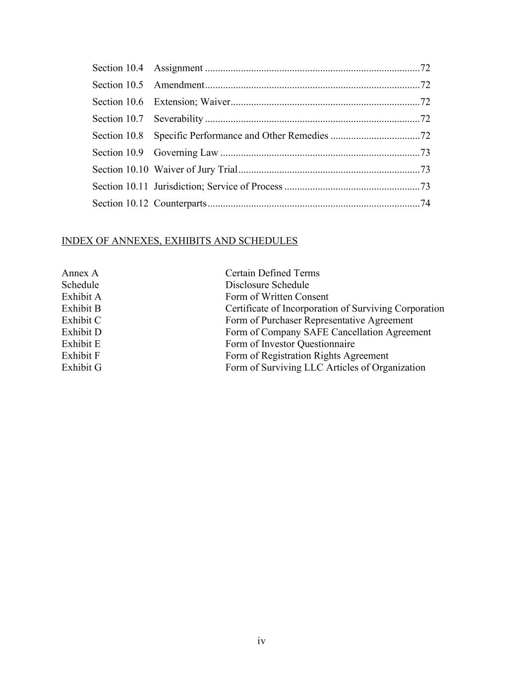 iv Section 10.4 Assignment .................................................................................... 72 Section 10.5 Amendment .................................................................................... 72 Section 10.6 Extension; Waiver .......................................................................... 72 Section 10.7 Severability .................................................................................... 72 Section 10.8 Specific Performance and Other Remedies ................................... 72 Section 10.9 Governing Law .............................................................................. 73 Section 10.10 Waiver of Jury Trial ....................................................................... 73 Section 10.11 Jurisdiction; Service of Process ..................................................... 73 Section 10.12 Counterparts ................................................................................... 74 INDEX OF ANNEXES, EXHIBITS AND SCHEDULES Annex A Certain Defined Terms Schedule Disclosure Schedule Exhibit A Form of Written Consent Exhibit B Certificate of Incorporation of Surviving Corporation Exhibit C Form of Purchaser Representative Agreement Exhibit D Form of Company SAFE Cancellation Agreement Exhibit E Form of Investor Questionnaire Exhibit F Form of Registration Rights Agreement Exhibit G Form of Surviving LLC Articles of Organization