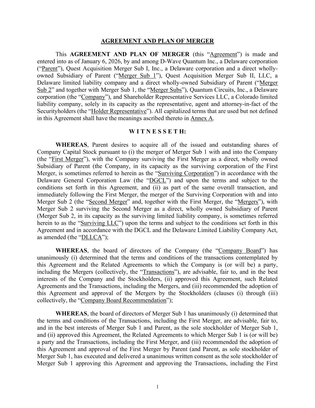 1 AGREEMENT AND PLAN OF MERGER This AGREEMENT AND PLAN OF MERGER (this “Agreement”) is made and entered into as of January 6, 2026, by and among D-Wave Quantum Inc., a Delaware corporation (“Parent”), Quest Acquisition Merger Sub I, Inc., a Delaware corporation and a direct wholly- owned Subsidiary of Parent (“Merger Sub 1”), Quest Acquisition Merger Sub II, LLC, a Delaware limited liability company and a direct wholly-owned Subsidiary of Parent (“Merger Sub 2” and together with Merger Sub 1, the “Merger Subs”), Quantum Circuits, Inc., a Delaware corporation (the “Company”), and Shareholder Representative Services LLC, a Colorado limited liability company, solely in its capacity as the representative, agent and attorney-in-fact of the Securityholders (the “Holder Representative”). All capitalized terms that are used but not defined in this Agreement shall have the meanings ascribed thereto in Annex A. W I T N E S S E T H: WHEREAS, Parent desires to acquire all of the issued and outstanding shares of Company Capital Stock pursuant to (i) the merger of Merger Sub 1 with and into the Company (the “First Merger”), with the Company surviving the First Merger as a direct, wholly owned Subsidiary of Parent (the Company, in its capacity as the surviving corporation of the First Merger, is sometimes referred to herein as the “Surviving Corporation”) in accordance with the Delaware General Corporation Law (the “DGCL”) and upon the terms and subject to the conditions set forth in this Agreement, and (ii) as part of the same overall transaction, and immediately following the First Merger, the merger of the Surviving Corporation with and into Merger Sub 2 (the “Second Merger” and, together with the First Merger, the “Mergers”), with Merger Sub 2 surviving the Second Merger as a direct, wholly owned Subsidiary of Parent (Merger Sub 2, in its capacity as the surviving limited liability company, is sometimes referred herein to as the “Surviving LLC”) upon the terms and subject to the conditions set forth in this Agreement and in accordance with the DGCL and the Delaware Limited Liability Company Act, as amended (the “DLLCA”); WHEREAS, the board of directors of the Company (the “Company Board”) has unanimously (i) determined that the terms and conditions of the transactions contemplated by this Agreement and the Related Agreements to which the Company is (or will be) a party, including the Mergers (collectively, the “Transactions”), are advisable, fair to, and in the best interests of the Company and the Stockholders, (ii) approved this Agreement, such Related Agreements and the Transactions, including the Mergers, and (iii) recommended the adoption of this Agreement and approval of the Mergers by the Stockholders (clauses (i) through (iii) collectively, the “Company Board Recommendation”); WHEREAS, the board of directors of Merger Sub 1 has unanimously (i) determined that the terms and conditions of the Transactions, including the First Merger, are advisable, fair to, and in the best interests of Merger Sub 1 and Parent, as the sole stockholder of Merger Sub 1, and (ii) approved this Agreement, the Related Agreements to which Merger Sub 1 is (or will be) a party and the Transactions, including the First Merger, and (iii) recommended the adoption of this Agreement and approval of the First Merger by Parent (and Parent, as sole stockholder of Merger Sub 1, has executed and delivered a unanimous written consent as the sole stockholder of Merger Sub 1 approving this Agreement and approving the Transactions, including the First