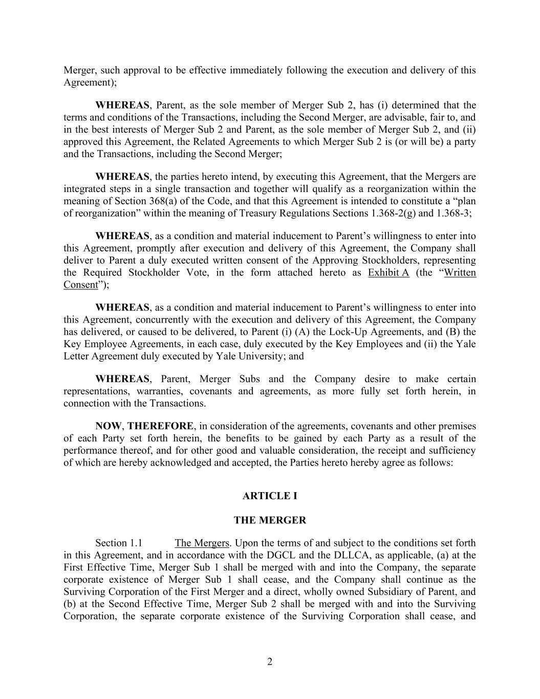 2 Merger, such approval to be effective immediately following the execution and delivery of this Agreement); WHEREAS, Parent, as the sole member of Merger Sub 2, has (i) determined that the terms and conditions of the Transactions, including the Second Merger, are advisable, fair to, and in the best interests of Merger Sub 2 and Parent, as the sole member of Merger Sub 2, and (ii) approved this Agreement, the Related Agreements to which Merger Sub 2 is (or will be) a party and the Transactions, including the Second Merger; WHEREAS, the parties hereto intend, by executing this Agreement, that the Mergers are integrated steps in a single transaction and together will qualify as a reorganization within the meaning of Section 368(a) of the Code, and that this Agreement is intended to constitute a “plan of reorganization” within the meaning of Treasury Regulations Sections 1.368-2(g) and 1.368-3; WHEREAS, as a condition and material inducement to Parent’s willingness to enter into this Agreement, promptly after execution and delivery of this Agreement, the Company shall deliver to Parent a duly executed written consent of the Approving Stockholders, representing the Required Stockholder Vote, in the form attached hereto as Exhibit A (the “Written Consent”); WHEREAS, as a condition and material inducement to Parent’s willingness to enter into this Agreement, concurrently with the execution and delivery of this Agreement, the Company has delivered, or caused to be delivered, to Parent (i) (A) the Lock-Up Agreements, and (B) the Key Employee Agreements, in each case, duly executed by the Key Employees and (ii) the Yale Letter Agreement duly executed by Yale University; and WHEREAS, Parent, Merger Subs and the Company desire to make certain representations, warranties, covenants and agreements, as more fully set forth herein, in connection with the Transactions. NOW, THEREFORE, in consideration of the agreements, covenants and other premises of each Party set forth herein, the benefits to be gained by each Party as a result of the performance thereof, and for other good and valuable consideration, the receipt and sufficiency of which are hereby acknowledged and accepted, the Parties hereto hereby agree as follows: ARTICLE I THE MERGER Section 1.1 The Mergers. Upon the terms of and subject to the conditions set forth in this Agreement, and in accordance with the DGCL and the DLLCA, as applicable, (a) at the First Effective Time, Merger Sub 1 shall be merged with and into the Company, the separate corporate existence of Merger Sub 1 shall cease, and the Company shall continue as the Surviving Corporation of the First Merger and a direct, wholly owned Subsidiary of Parent, and (b) at the Second Effective Time, Merger Sub 2 shall be merged with and into the Surviving Corporation, the separate corporate existence of the Surviving Corporation shall cease, and