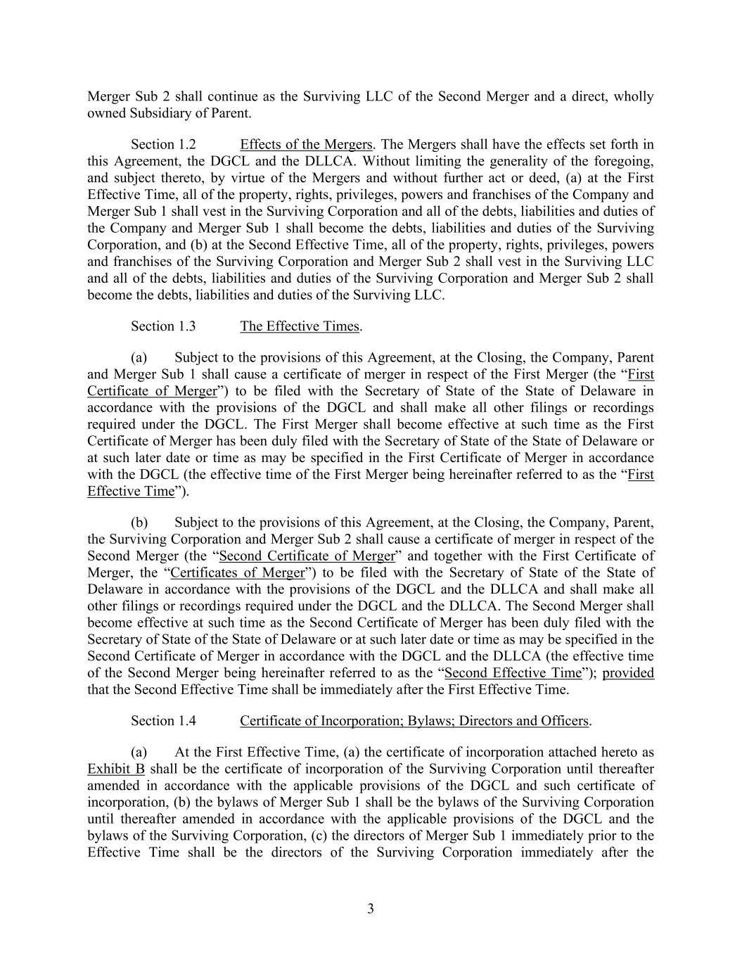 3 Merger Sub 2 shall continue as the Surviving LLC of the Second Merger and a direct, wholly owned Subsidiary of Parent. Section 1.2 Effects of the Mergers. The Mergers shall have the effects set forth in this Agreement, the DGCL and the DLLCA. Without limiting the generality of the foregoing, and subject thereto, by virtue of the Mergers and without further act or deed, (a) at the First Effective Time, all of the property, rights, privileges, powers and franchises of the Company and Merger Sub 1 shall vest in the Surviving Corporation and all of the debts, liabilities and duties of the Company and Merger Sub 1 shall become the debts, liabilities and duties of the Surviving Corporation, and (b) at the Second Effective Time, all of the property, rights, privileges, powers and franchises of the Surviving Corporation and Merger Sub 2 shall vest in the Surviving LLC and all of the debts, liabilities and duties of the Surviving Corporation and Merger Sub 2 shall become the debts, liabilities and duties of the Surviving LLC. Section 1.3 The Effective Times. (a) Subject to the provisions of this Agreement, at the Closing, the Company, Parent and Merger Sub 1 shall cause a certificate of merger in respect of the First Merger (the “First Certificate of Merger”) to be filed with the Secretary of State of the State of Delaware in accordance with the provisions of the DGCL and shall make all other filings or recordings required under the DGCL. The First Merger shall become effective at such time as the First Certificate of Merger has been duly filed with the Secretary of State of the State of Delaware or at such later date or time as may be specified in the First Certificate of Merger in accordance with the DGCL (the effective time of the First Merger being hereinafter referred to as the “First Effective Time”). (b) Subject to the provisions of this Agreement, at the Closing, the Company, Parent, the Surviving Corporation and Merger Sub 2 shall cause a certificate of merger in respect of the Second Merger (the “Second Certificate of Merger” and together with the First Certificate of Merger, the “Certificates of Merger”) to be filed with the Secretary of State of the State of Delaware in accordance with the provisions of the DGCL and the DLLCA and shall make all other filings or recordings required under the DGCL and the DLLCA. The Second Merger shall become effective at such time as the Second Certificate of Merger has been duly filed with the Secretary of State of the State of Delaware or at such later date or time as may be specified in the Second Certificate of Merger in accordance with the DGCL and the DLLCA (the effective time of the Second Merger being hereinafter referred to as the “Second Effective Time”); provided that the Second Effective Time shall be immediately after the First Effective Time. Section 1.4 Certificate of Incorporation; Bylaws; Directors and Officers. (a) At the First Effective Time, (a) the certificate of incorporation attached hereto as Exhibit B shall be the certificate of incorporation of the Surviving Corporation until thereafter amended in accordance with the applicable provisions of the DGCL and such certificate of incorporation, (b) the bylaws of Merger Sub 1 shall be the bylaws of the Surviving Corporation until thereafter amended in accordance with the applicable provisions of the DGCL and the bylaws of the Surviving Corporation, (c) the directors of Merger Sub 1 immediately prior to the Effective Time shall be the directors of the Surviving Corporation immediately after the