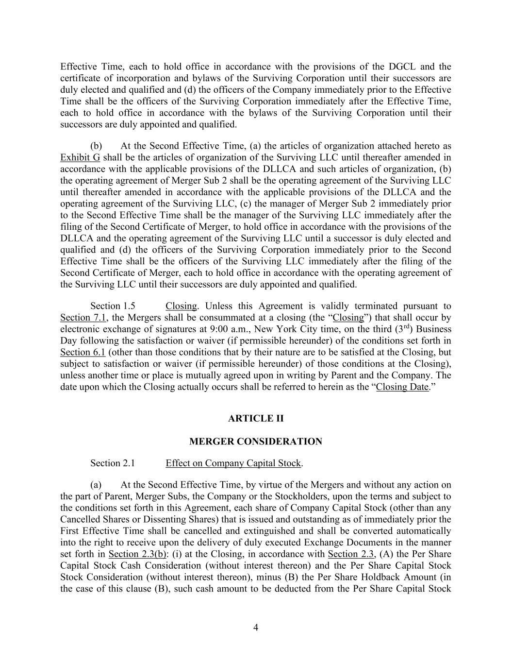 4 Effective Time, each to hold office in accordance with the provisions of the DGCL and the certificate of incorporation and bylaws of the Surviving Corporation until their successors are duly elected and qualified and (d) the officers of the Company immediately prior to the Effective Time shall be the officers of the Surviving Corporation immediately after the Effective Time, each to hold office in accordance with the bylaws of the Surviving Corporation until their successors are duly appointed and qualified. (b) At the Second Effective Time, (a) the articles of organization attached hereto as Exhibit G shall be the articles of organization of the Surviving LLC until thereafter amended in accordance with the applicable provisions of the DLLCA and such articles of organization, (b) the operating agreement of Merger Sub 2 shall be the operating agreement of the Surviving LLC until thereafter amended in accordance with the applicable provisions of the DLLCA and the operating agreement of the Surviving LLC, (c) the manager of Merger Sub 2 immediately prior to the Second Effective Time shall be the manager of the Surviving LLC immediately after the filing of the Second Certificate of Merger, to hold office in accordance with the provisions of the DLLCA and the operating agreement of the Surviving LLC until a successor is duly elected and qualified and (d) the officers of the Surviving Corporation immediately prior to the Second Effective Time shall be the officers of the Surviving LLC immediately after the filing of the Second Certificate of Merger, each to hold office in accordance with the operating agreement of the Surviving LLC until their successors are duly appointed and qualified. Section 1.5 Closing. Unless this Agreement is validly terminated pursuant to Section 7.1, the Mergers shall be consummated at a closing (the “Closing”) that shall occur by electronic exchange of signatures at 9:00 a.m., New York City time, on the third (3rd) Business Day following the satisfaction or waiver (if permissible hereunder) of the conditions set forth in Section 6.1 (other than those conditions that by their nature are to be satisfied at the Closing, but subject to satisfaction or waiver (if permissible hereunder) of those conditions at the Closing), unless another time or place is mutually agreed upon in writing by Parent and the Company. The date upon which the Closing actually occurs shall be referred to herein as the “Closing Date.” ARTICLE II MERGER CONSIDERATION Section 2.1 Effect on Company Capital Stock. (a) At the Second Effective Time, by virtue of the Mergers and without any action on the part of Parent, Merger Subs, the Company or the Stockholders, upon the terms and subject to the conditions set forth in this Agreement, each share of Company Capital Stock (other than any Cancelled Shares or Dissenting Shares) that is issued and outstanding as of immediately prior the First Effective Time shall be cancelled and extinguished and shall be converted automatically into the right to receive upon the delivery of duly executed Exchange Documents in the manner set forth in Section 2.3(b): (i) at the Closing, in accordance with Section 2.3, (A) the Per Share Capital Stock Cash Consideration (without interest thereon) and the Per Share Capital Stock Stock Consideration (without interest thereon), minus (B) the Per Share Holdback Amount (in the case of this clause (B), such cash amount to be deducted from the Per Share Capital Stock