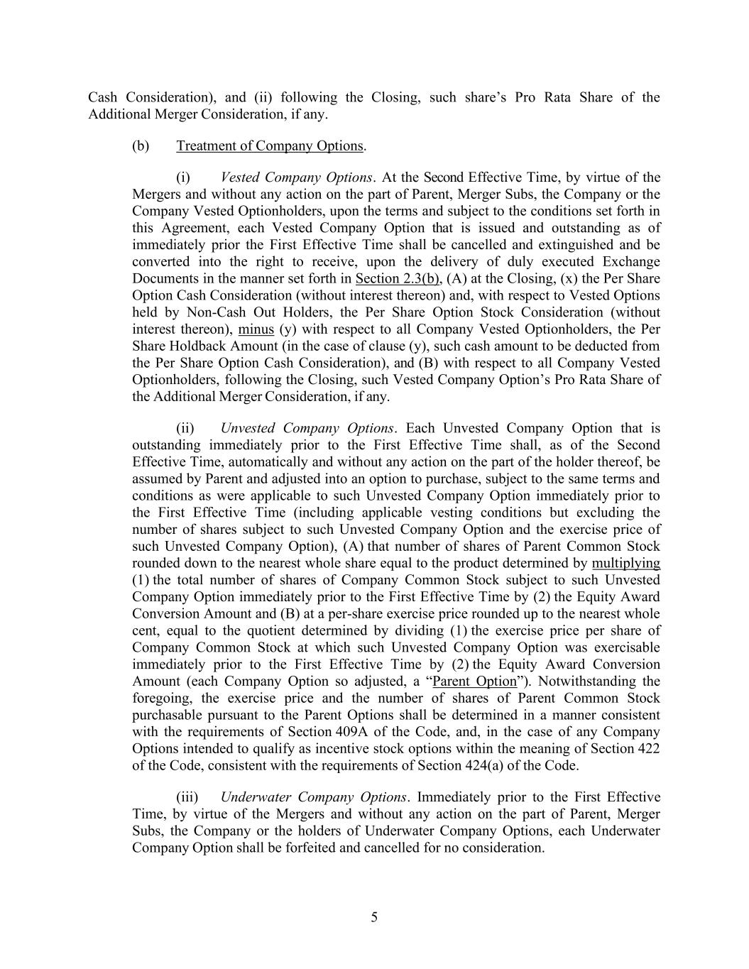 5 Cash Consideration), and (ii) following the Closing, such share’s Pro Rata Share of the Additional Merger Consideration, if any. (b) Treatment of Company Options. (i) Vested Company Options. At the Second Effective Time, by virtue of the Mergers and without any action on the part of Parent, Merger Subs, the Company or the Company Vested Optionholders, upon the terms and subject to the conditions set forth in this Agreement, each Vested Company Option that is issued and outstanding as of immediately prior the First Effective Time shall be cancelled and extinguished and be converted into the right to receive, upon the delivery of duly executed Exchange Documents in the manner set forth in Section 2.3(b), (A) at the Closing, (x) the Per Share Option Cash Consideration (without interest thereon) and, with respect to Vested Options held by Non-Cash Out Holders, the Per Share Option Stock Consideration (without interest thereon), minus (y) with respect to all Company Vested Optionholders, the Per Share Holdback Amount (in the case of clause (y), such cash amount to be deducted from the Per Share Option Cash Consideration), and (B) with respect to all Company Vested Optionholders, following the Closing, such Vested Company Option’s Pro Rata Share of the Additional Merger Consideration, if any. (ii) Unvested Company Options. Each Unvested Company Option that is outstanding immediately prior to the First Effective Time shall, as of the Second Effective Time, automatically and without any action on the part of the holder thereof, be assumed by Parent and adjusted into an option to purchase, subject to the same terms and conditions as were applicable to such Unvested Company Option immediately prior to the First Effective Time (including applicable vesting conditions but excluding the number of shares subject to such Unvested Company Option and the exercise price of such Unvested Company Option), (A) that number of shares of Parent Common Stock rounded down to the nearest whole share equal to the product determined by multiplying (1) the total number of shares of Company Common Stock subject to such Unvested Company Option immediately prior to the First Effective Time by (2) the Equity Award Conversion Amount and (B) at a per-share exercise price rounded up to the nearest whole cent, equal to the quotient determined by dividing (1) the exercise price per share of Company Common Stock at which such Unvested Company Option was exercisable immediately prior to the First Effective Time by (2) the Equity Award Conversion Amount (each Company Option so adjusted, a “Parent Option”). Notwithstanding the foregoing, the exercise price and the number of shares of Parent Common Stock purchasable pursuant to the Parent Options shall be determined in a manner consistent with the requirements of Section 409A of the Code, and, in the case of any Company Options intended to qualify as incentive stock options within the meaning of Section 422 of the Code, consistent with the requirements of Section 424(a) of the Code. (iii) Underwater Company Options. Immediately prior to the First Effective Time, by virtue of the Mergers and without any action on the part of Parent, Merger Subs, the Company or the holders of Underwater Company Options, each Underwater Company Option shall be forfeited and cancelled for no consideration.