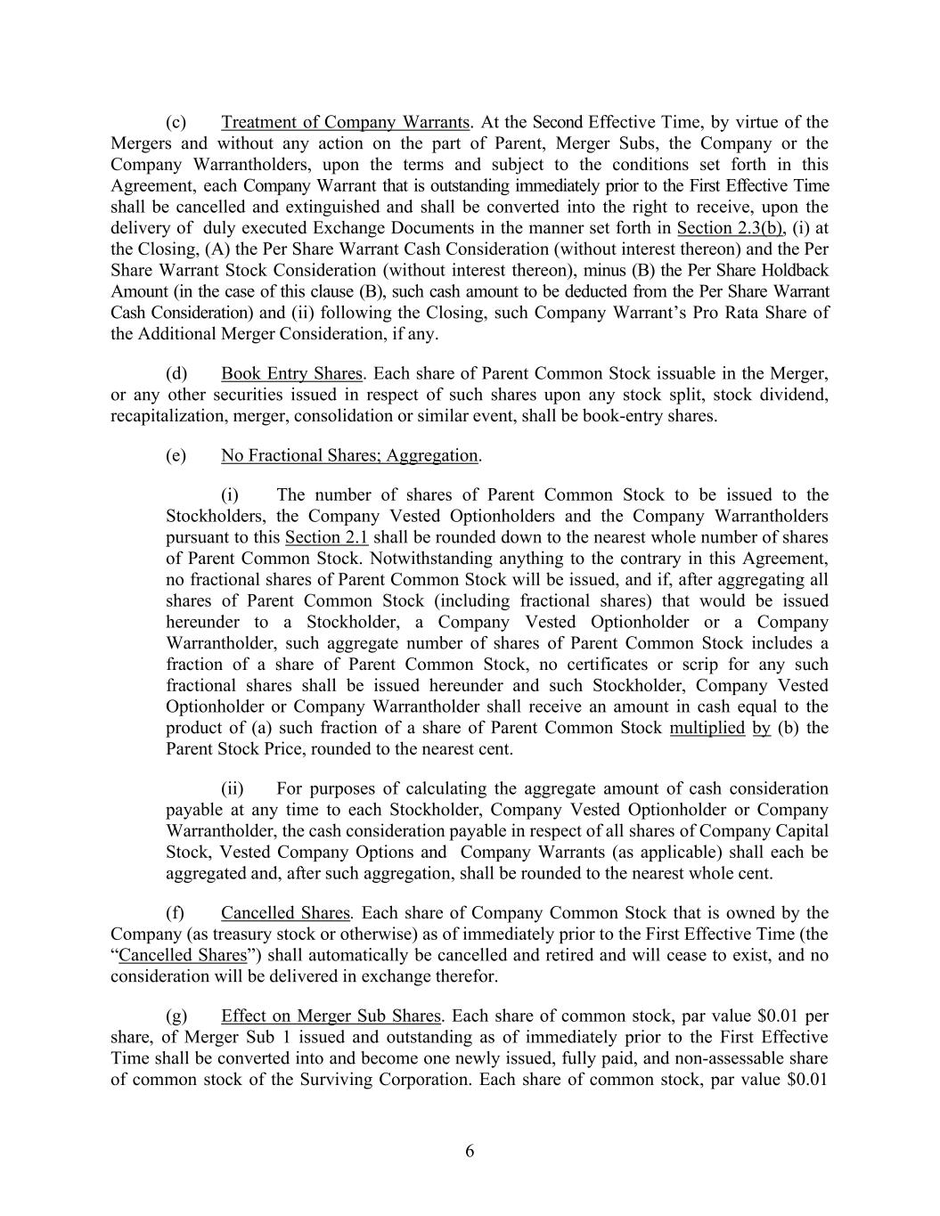 6 (c) Treatment of Company Warrants. At the Second Effective Time, by virtue of the Mergers and without any action on the part of Parent, Merger Subs, the Company or the Company Warrantholders, upon the terms and subject to the conditions set forth in this Agreement, each Company Warrant that is outstanding immediately prior to the First Effective Time shall be cancelled and extinguished and shall be converted into the right to receive, upon the delivery of duly executed Exchange Documents in the manner set forth in Section 2.3(b), (i) at the Closing, (A) the Per Share Warrant Cash Consideration (without interest thereon) and the Per Share Warrant Stock Consideration (without interest thereon), minus (B) the Per Share Holdback Amount (in the case of this clause (B), such cash amount to be deducted from the Per Share Warrant Cash Consideration) and (ii) following the Closing, such Company Warrant’s Pro Rata Share of the Additional Merger Consideration, if any. (d) Book Entry Shares. Each share of Parent Common Stock issuable in the Merger, or any other securities issued in respect of such shares upon any stock split, stock dividend, recapitalization, merger, consolidation or similar event, shall be book-entry shares. (e) No Fractional Shares; Aggregation. (i) The number of shares of Parent Common Stock to be issued to the Stockholders, the Company Vested Optionholders and the Company Warrantholders pursuant to this Section 2.1 shall be rounded down to the nearest whole number of shares of Parent Common Stock. Notwithstanding anything to the contrary in this Agreement, no fractional shares of Parent Common Stock will be issued, and if, after aggregating all shares of Parent Common Stock (including fractional shares) that would be issued hereunder to a Stockholder, a Company Vested Optionholder or a Company Warrantholder, such aggregate number of shares of Parent Common Stock includes a fraction of a share of Parent Common Stock, no certificates or scrip for any such fractional shares shall be issued hereunder and such Stockholder, Company Vested Optionholder or Company Warrantholder shall receive an amount in cash equal to the product of (a) such fraction of a share of Parent Common Stock multiplied by (b) the Parent Stock Price, rounded to the nearest cent. (ii) For purposes of calculating the aggregate amount of cash consideration payable at any time to each Stockholder, Company Vested Optionholder or Company Warrantholder, the cash consideration payable in respect of all shares of Company Capital Stock, Vested Company Options and Company Warrants (as applicable) shall each be aggregated and, after such aggregation, shall be rounded to the nearest whole cent. (f) Cancelled Shares. Each share of Company Common Stock that is owned by the Company (as treasury stock or otherwise) as of immediately prior to the First Effective Time (the “Cancelled Shares”) shall automatically be cancelled and retired and will cease to exist, and no consideration will be delivered in exchange therefor. (g) Effect on Merger Sub Shares. Each share of common stock, par value $0.01 per share, of Merger Sub 1 issued and outstanding as of immediately prior to the First Effective Time shall be converted into and become one newly issued, fully paid, and non-assessable share of common stock of the Surviving Corporation. Each share of common stock, par value $0.01