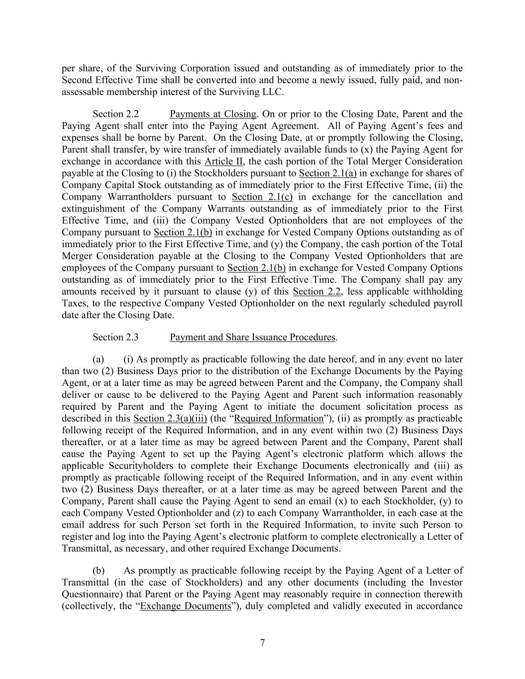 7 per share, of the Surviving Corporation issued and outstanding as of immediately prior to the Second Effective Time shall be converted into and become a newly issued, fully paid, and non- assessable membership interest of the Surviving LLC. Section 2.2 Payments at Closing. On or prior to the Closing Date, Parent and the Paying Agent shall enter into the Paying Agent Agreement. All of Paying Agent’s fees and expenses shall be borne by Parent. On the Closing Date, at or promptly following the Closing, Parent shall transfer, by wire transfer of immediately available funds to (x) the Paying Agent for exchange in accordance with this Article II, the cash portion of the Total Merger Consideration payable at the Closing to (i) the Stockholders pursuant to Section 2.1(a) in exchange for shares of Company Capital Stock outstanding as of immediately prior to the First Effective Time, (ii) the Company Warrantholders pursuant to Section 2.1(c) in exchange for the cancellation and extinguishment of the Company Warrants outstanding as of immediately prior to the First Effective Time, and (iii) the Company Vested Optionholders that are not employees of the Company pursuant to Section 2.1(b) in exchange for Vested Company Options outstanding as of immediately prior to the First Effective Time, and (y) the Company, the cash portion of the Total Merger Consideration payable at the Closing to the Company Vested Optionholders that are employees of the Company pursuant to Section 2.1(b) in exchange for Vested Company Options outstanding as of immediately prior to the First Effective Time. The Company shall pay any amounts received by it pursuant to clause (y) of this Section 2.2, less applicable withholding Taxes, to the respective Company Vested Optionholder on the next regularly scheduled payroll date after the Closing Date. Section 2.3 Payment and Share Issuance Procedures. (a) (i) As promptly as practicable following the date hereof, and in any event no later than two (2) Business Days prior to the distribution of the Exchange Documents by the Paying Agent, or at a later time as may be agreed between Parent and the Company, the Company shall deliver or cause to be delivered to the Paying Agent and Parent such information reasonably required by Parent and the Paying Agent to initiate the document solicitation process as described in this Section 2.3(a)(iii) (the “Required Information”), (ii) as promptly as practicable following receipt of the Required Information, and in any event within two (2) Business Days thereafter, or at a later time as may be agreed between Parent and the Company, Parent shall cause the Paying Agent to set up the Paying Agent’s electronic platform which allows the applicable Securityholders to complete their Exchange Documents electronically and (iii) as promptly as practicable following receipt of the Required Information, and in any event within two (2) Business Days thereafter, or at a later time as may be agreed between Parent and the Company, Parent shall cause the Paying Agent to send an email (x) to each Stockholder, (y) to each Company Vested Optionholder and (z) to each Company Warrantholder, in each case at the email address for such Person set forth in the Required Information, to invite such Person to register and log into the Paying Agent’s electronic platform to complete electronically a Letter of Transmittal, as necessary, and other required Exchange Documents. (b) As promptly as practicable following receipt by the Paying Agent of a Letter of Transmittal (in the case of Stockholders) and any other documents (including the Investor Questionnaire) that Parent or the Paying Agent may reasonably require in connection therewith (collectively, the “Exchange Documents”), duly completed and validly executed in accordance