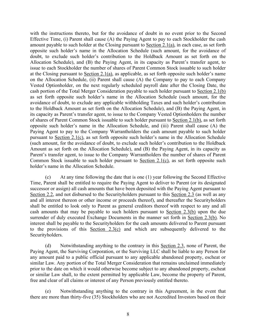 8 with the instructions thereto, but for the avoidance of doubt in no event prior to the Second Effective Time, (i) Parent shall cause (A) the Paying Agent to pay to each Stockholder the cash amount payable to such holder at the Closing pursuant to Section 2.1(a), in each case, as set forth opposite such holder’s name in the Allocation Schedule (such amount, for the avoidance of doubt, to exclude such holder’s contribution to the Holdback Amount as set forth on the Allocation Schedule), and (B) the Paying Agent, in its capacity as Parent’s transfer agent, to issue to each Stockholder the number of shares of Parent Common Stock issuable to such holder at the Closing pursuant to Section 2.1(a), as applicable, as set forth opposite such holder’s name on the Allocation Schedule, (ii) Parent shall cause (A) the Company to pay to each Company Vested Optionholder, on the next regularly scheduled payroll date after the Closing Date, the cash portion of the Total Merger Consideration payable to such holder pursuant to Section 2.1(b) as set forth opposite such holder’s name in the Allocation Schedule (such amount, for the avoidance of doubt, to exclude any applicable withholding Taxes and such holder’s contribution to the Holdback Amount as set forth on the Allocation Schedule), and (B) the Paying Agent, in its capacity as Parent’s transfer agent, to issue to the Company Vested Optionholders the number of shares of Parent Common Stock issuable to such holder pursuant to Section 2.1(b), as set forth opposite such holder’s name in the Allocation Schedule, and (iii) Parent shall cause (A) the Paying Agent to pay to the Company Warrantholders the cash amount payable to such holder pursuant to Section 2.1(c), as set forth opposite such holder’s name in the Allocation Schedule (such amount, for the avoidance of doubt, to exclude such holder’s contribution to the Holdback Amount as set forth on the Allocation Schedule), and (B) the Paying Agent, in its capacity as Parent’s transfer agent, to issue to the Company Warrantholders the number of shares of Parent Common Stock issuable to such holder pursuant to Section 2.1(c), as set forth opposite such holder’s name in the Allocation Schedule. (c) At any time following the date that is one (1) year following the Second Effective Time, Parent shall be entitled to require the Paying Agent to deliver to Parent (or its designated successor or assign) all cash amounts that have been deposited with the Paying Agent pursuant to Section 2.2, and not disbursed to the Securityholders pursuant to this Section 2.3 (as well as any and all interest thereon or other income or proceeds thereof), and thereafter the Securityholders shall be entitled to look only to Parent as general creditors thereof with respect to any and all cash amounts that may be payable to such holders pursuant to Section 2.3(b) upon the due surrender of duly executed Exchange Documents in the manner set forth in Section 2.3(b). No interest shall be payable to the Securityholders for the cash amounts delivered to Parent pursuant to the provisions of this Section 2.3(c) and which are subsequently delivered to the Securityholders. (d) Notwithstanding anything to the contrary in this Section 2.3, none of Parent, the Paying Agent, the Surviving Corporation, or the Surviving LLC shall be liable to any Person for any amount paid to a public official pursuant to any applicable abandoned property, escheat or similar Law. Any portion of the Total Merger Consideration that remains unclaimed immediately prior to the date on which it would otherwise become subject to any abandoned property, escheat or similar Law shall, to the extent permitted by applicable Law, become the property of Parent, free and clear of all claims or interest of any Person previously entitled thereto. (e) Notwithstanding anything to the contrary in this Agreement, in the event that there are more than thirty-five (35) Stockholders who are not Accredited Investors based on their