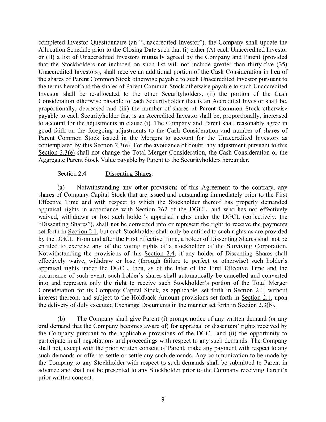 9 completed Investor Questionnaire (an “Unaccredited Investor”), the Company shall update the Allocation Schedule prior to the Closing Date such that (i) either (A) each Unaccredited Investor or (B) a list of Unaccredited Investors mutually agreed by the Company and Parent (provided that the Stockholders not included on such list will not include greater than thirty-five (35) Unaccredited Investors), shall receive an additional portion of the Cash Consideration in lieu of the shares of Parent Common Stock otherwise payable to such Unaccredited Investor pursuant to the terms hereof and the shares of Parent Common Stock otherwise payable to such Unaccredited Investor shall be re-allocated to the other Securityholders, (ii) the portion of the Cash Consideration otherwise payable to each Securityholder that is an Accredited Investor shall be, proportionally, decreased and (iii) the number of shares of Parent Common Stock otherwise payable to each Securityholder that is an Accredited Investor shall be, proportionally, increased to account for the adjustments in clause (i). The Company and Parent shall reasonably agree in good faith on the foregoing adjustments to the Cash Consideration and number of shares of Parent Common Stock issued in the Mergers to account for the Unaccredited Investors as contemplated by this Section 2.3(e). For the avoidance of doubt, any adjustment pursuant to this Section 2.3(e) shall not change the Total Merger Consideration, the Cash Consideration or the Aggregate Parent Stock Value payable by Parent to the Securityholders hereunder. Section 2.4 Dissenting Shares. (a) Notwithstanding any other provisions of this Agreement to the contrary, any shares of Company Capital Stock that are issued and outstanding immediately prior to the First Effective Time and with respect to which the Stockholder thereof has properly demanded appraisal rights in accordance with Section 262 of the DGCL, and who has not effectively waived, withdrawn or lost such holder’s appraisal rights under the DGCL (collectively, the “Dissenting Shares”), shall not be converted into or represent the right to receive the payments set forth in Section 2.1, but such Stockholder shall only be entitled to such rights as are provided by the DGCL. From and after the First Effective Time, a holder of Dissenting Shares shall not be entitled to exercise any of the voting rights of a stockholder of the Surviving Corporation. Notwithstanding the provisions of this Section 2.4, if any holder of Dissenting Shares shall effectively waive, withdraw or lose (through failure to perfect or otherwise) such holder’s appraisal rights under the DGCL, then, as of the later of the First Effective Time and the occurrence of such event, such holder’s shares shall automatically be cancelled and converted into and represent only the right to receive such Stockholder’s portion of the Total Merger Consideration for its Company Capital Stock, as applicable, set forth in Section 2.1, without interest thereon, and subject to the Holdback Amount provisions set forth in Section 2.1, upon the delivery of duly executed Exchange Documents in the manner set forth in Section 2.3(b). (b) The Company shall give Parent (i) prompt notice of any written demand (or any oral demand that the Company becomes aware of) for appraisal or dissenters’ rights received by the Company pursuant to the applicable provisions of the DGCL and (ii) the opportunity to participate in all negotiations and proceedings with respect to any such demands. The Company shall not, except with the prior written consent of Parent, make any payment with respect to any such demands or offer to settle or settle any such demands. Any communication to be made by the Company to any Stockholder with respect to such demands shall be submitted to Parent in advance and shall not be presented to any Stockholder prior to the Company receiving Parent’s prior written consent.