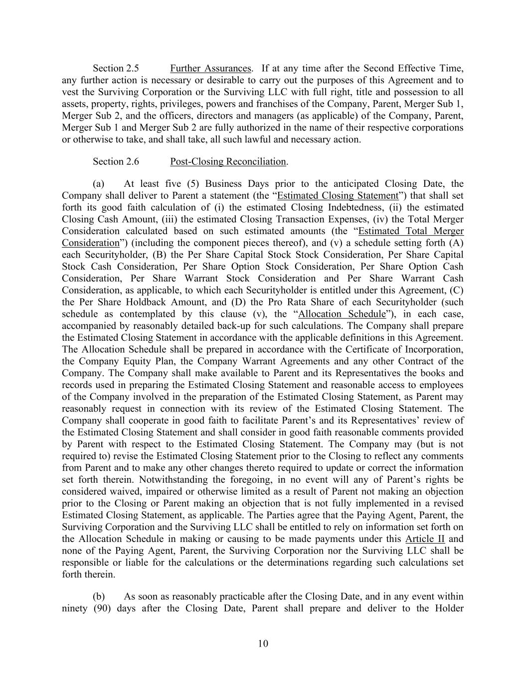 10 Section 2.5 Further Assurances. If at any time after the Second Effective Time, any further action is necessary or desirable to carry out the purposes of this Agreement and to vest the Surviving Corporation or the Surviving LLC with full right, title and possession to all assets, property, rights, privileges, powers and franchises of the Company, Parent, Merger Sub 1, Merger Sub 2, and the officers, directors and managers (as applicable) of the Company, Parent, Merger Sub 1 and Merger Sub 2 are fully authorized in the name of their respective corporations or otherwise to take, and shall take, all such lawful and necessary action. Section 2.6 Post-Closing Reconciliation. (a) At least five (5) Business Days prior to the anticipated Closing Date, the Company shall deliver to Parent a statement (the “Estimated Closing Statement”) that shall set forth its good faith calculation of (i) the estimated Closing Indebtedness, (ii) the estimated Closing Cash Amount, (iii) the estimated Closing Transaction Expenses, (iv) the Total Merger Consideration calculated based on such estimated amounts (the “Estimated Total Merger Consideration”) (including the component pieces thereof), and (v) a schedule setting forth (A) each Securityholder, (B) the Per Share Capital Stock Stock Consideration, Per Share Capital Stock Cash Consideration, Per Share Option Stock Consideration, Per Share Option Cash Consideration, Per Share Warrant Stock Consideration and Per Share Warrant Cash Consideration, as applicable, to which each Securityholder is entitled under this Agreement, (C) the Per Share Holdback Amount, and (D) the Pro Rata Share of each Securityholder (such schedule as contemplated by this clause (v), the “Allocation Schedule”), in each case, accompanied by reasonably detailed back-up for such calculations. The Company shall prepare the Estimated Closing Statement in accordance with the applicable definitions in this Agreement. The Allocation Schedule shall be prepared in accordance with the Certificate of Incorporation, the Company Equity Plan, the Company Warrant Agreements and any other Contract of the Company. The Company shall make available to Parent and its Representatives the books and records used in preparing the Estimated Closing Statement and reasonable access to employees of the Company involved in the preparation of the Estimated Closing Statement, as Parent may reasonably request in connection with its review of the Estimated Closing Statement. The Company shall cooperate in good faith to facilitate Parent’s and its Representatives’ review of the Estimated Closing Statement and shall consider in good faith reasonable comments provided by Parent with respect to the Estimated Closing Statement. The Company may (but is not required to) revise the Estimated Closing Statement prior to the Closing to reflect any comments from Parent and to make any other changes thereto required to update or correct the information set forth therein. Notwithstanding the foregoing, in no event will any of Parent’s rights be considered waived, impaired or otherwise limited as a result of Parent not making an objection prior to the Closing or Parent making an objection that is not fully implemented in a revised Estimated Closing Statement, as applicable. The Parties agree that the Paying Agent, Parent, the Surviving Corporation and the Surviving LLC shall be entitled to rely on information set forth on the Allocation Schedule in making or causing to be made payments under this Article II and none of the Paying Agent, Parent, the Surviving Corporation nor the Surviving LLC shall be responsible or liable for the calculations or the determinations regarding such calculations set forth therein. (b) As soon as reasonably practicable after the Closing Date, and in any event within ninety (90) days after the Closing Date, Parent shall prepare and deliver to the Holder